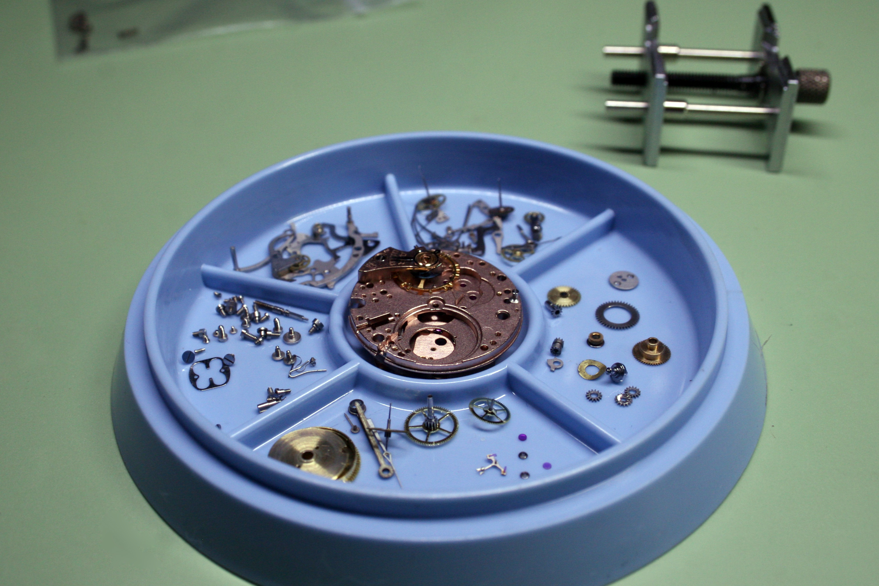 I discovered in watchmaking the learning curve can be a little rough. The first thing you realize as an amateur is that every part is so much smaller than you expected it to be. Next you find that coordination with tweezers is an acquired skill and watch parts have a tendency to rocket from the tips of the tweezers at great speed. You also discover that you do not know intrinsicly which screw goes into which hole!