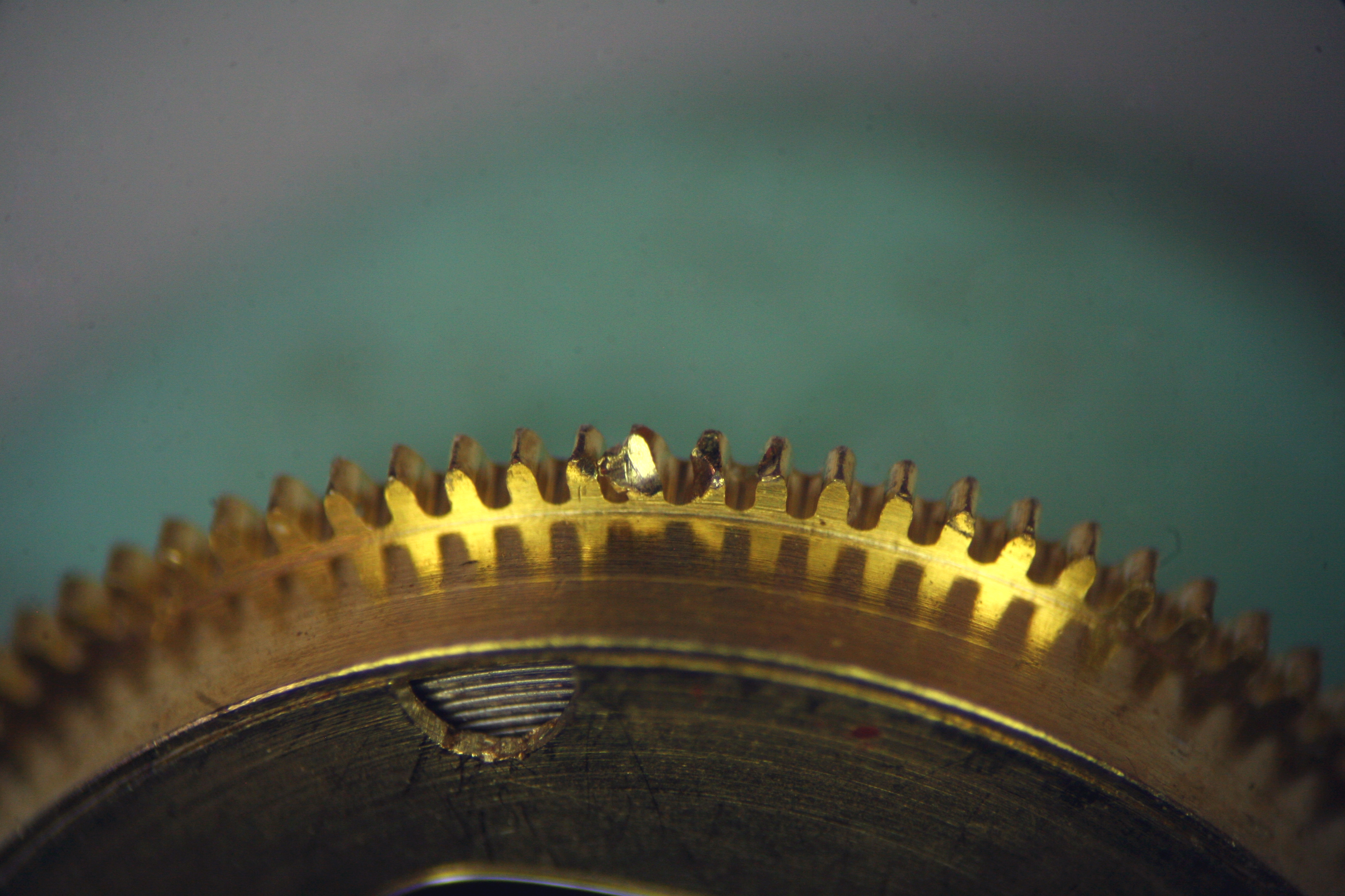 Following a soak in the ultrasonic cleaner, the movement was ready for reassembly. I started by installing a new mainspring in the barrel and here the next problem became apparent. The gear teeth on the mainspring barrel were damaged. Since there was no way to repair this, a new barrel needed to be ordered.