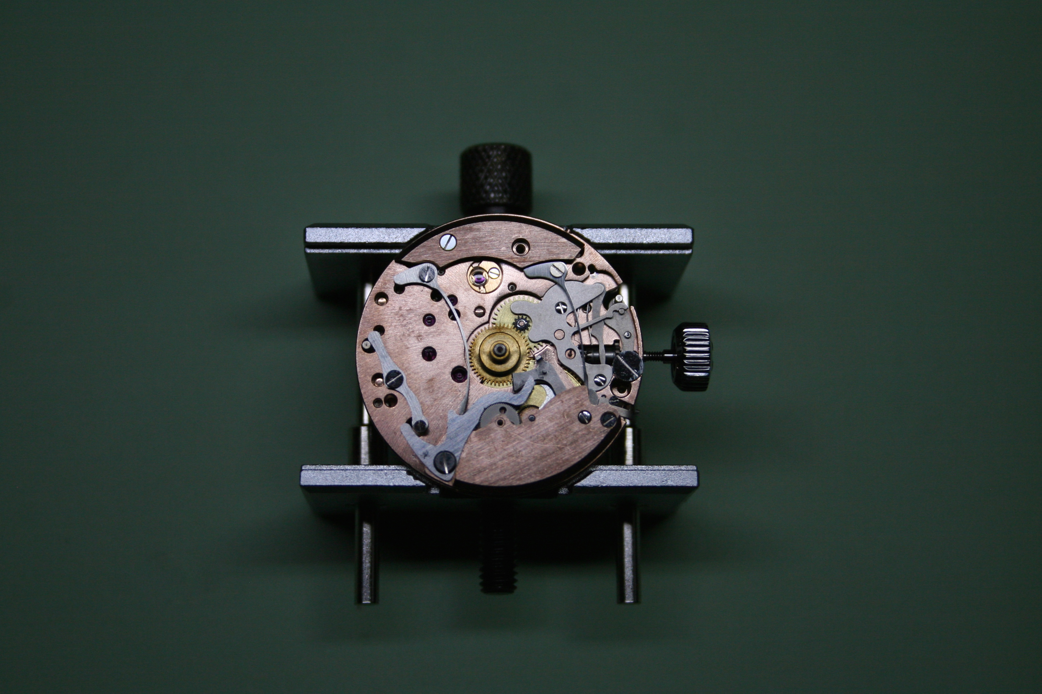 Once the chronograph was together adjustments were made under the microscope to ensure the proper depth of the gear teeth and confirm elapsed minutes and hours were being registered. With everything operating properly it was time for a quick pat on the back before installing the dial and hands.