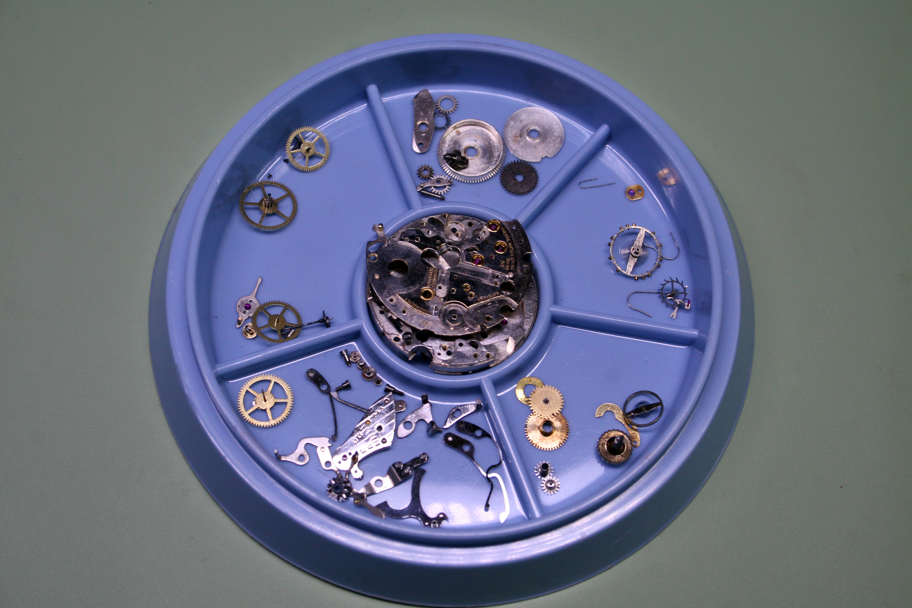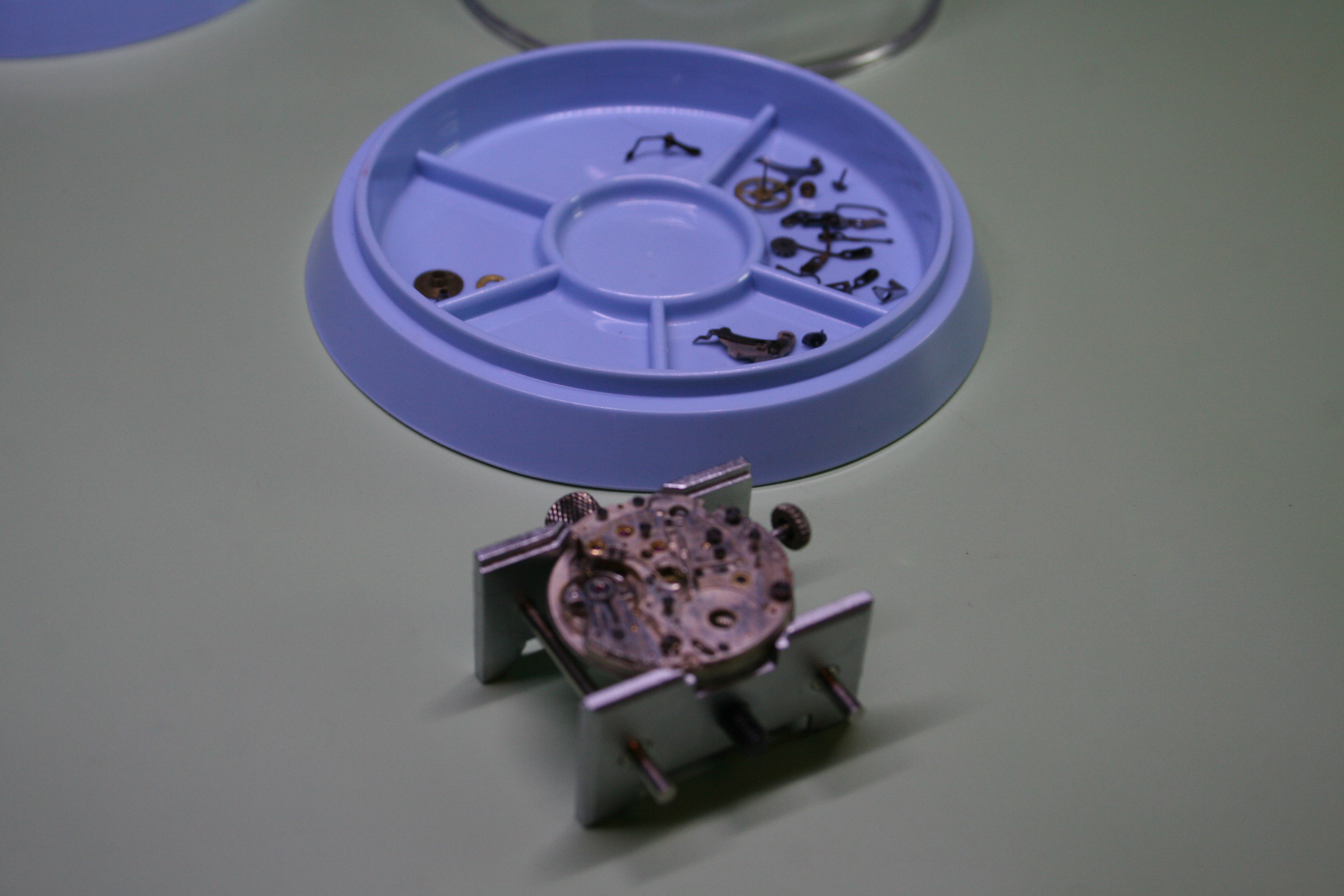 Chronographs have many bits and pieces since they are essentially a clock and a stop watch all in one. Here you can see all the parts that make up the chronograph layer (the stop watch works) in the tray while I have yet to break down the timekeeping elements of the watch.