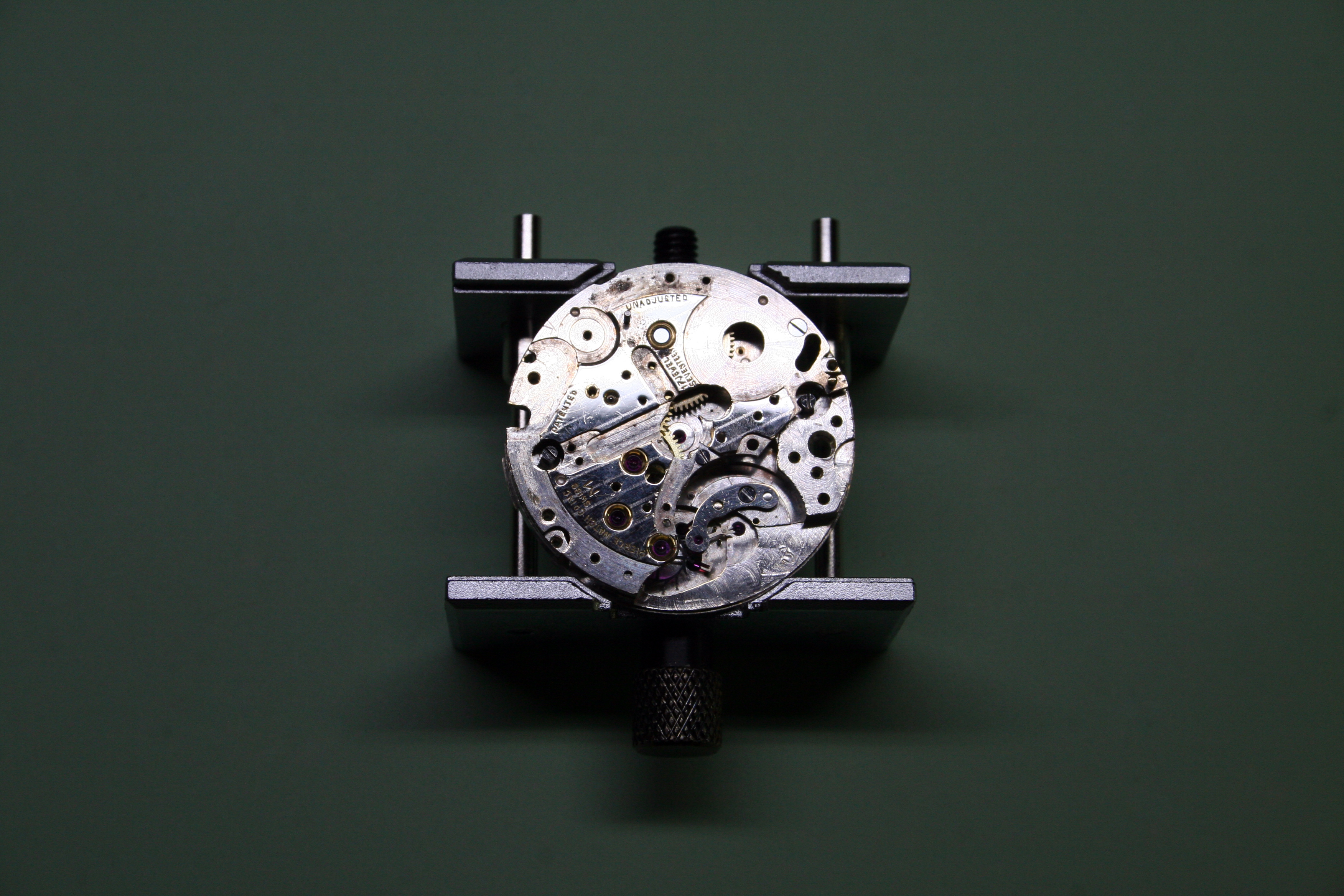 Proceeding methodically I removed the levers and springs that made up the chronograph. Most screws were returned to their respective holes to speed reassembly later.