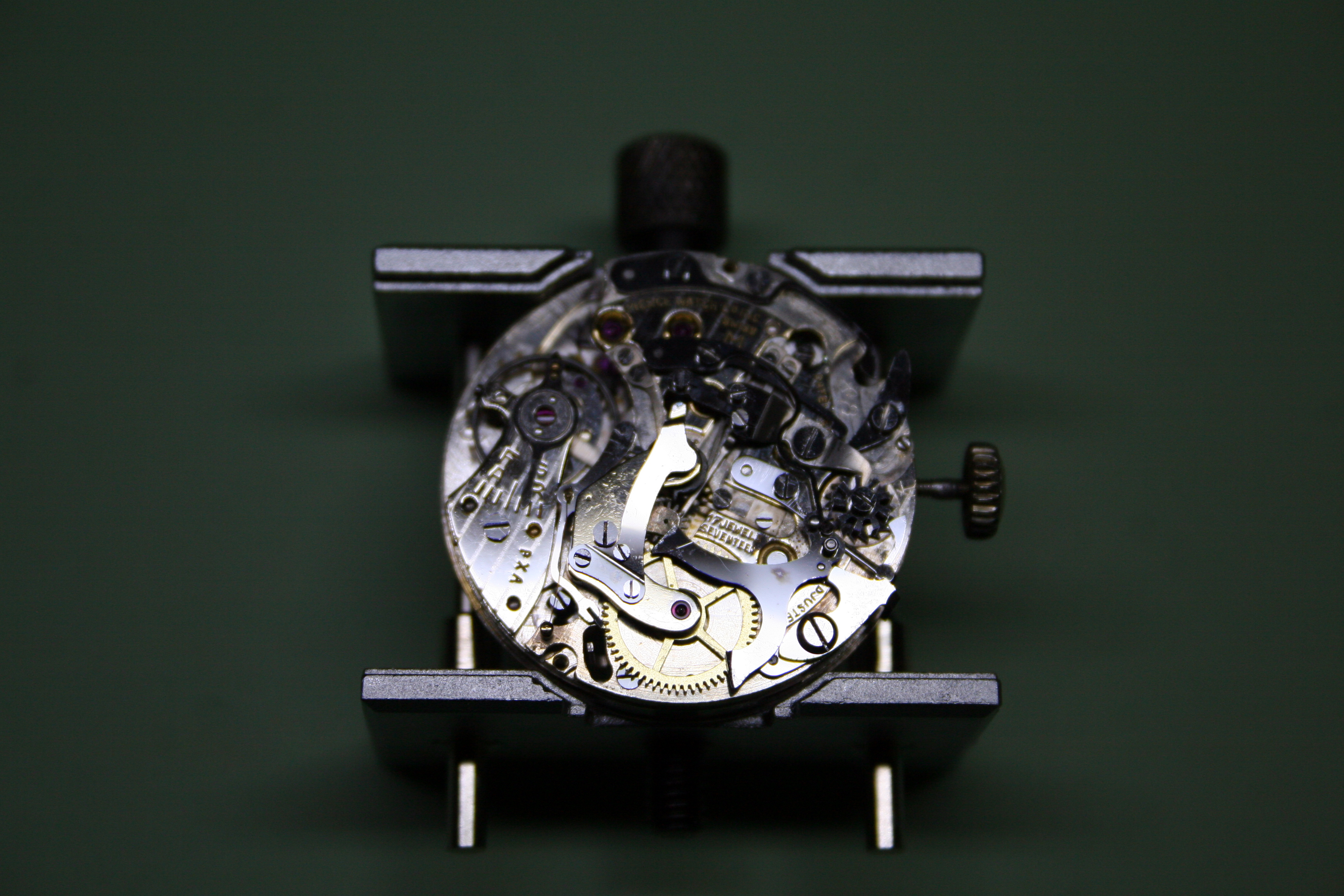 The watch was then re-cased. With the pushers installed in the case I could begin adjusting the chronograph to ensure its smooth operation. There are many springs which require adjustment before the chronograph will function properly without stopping the watch.