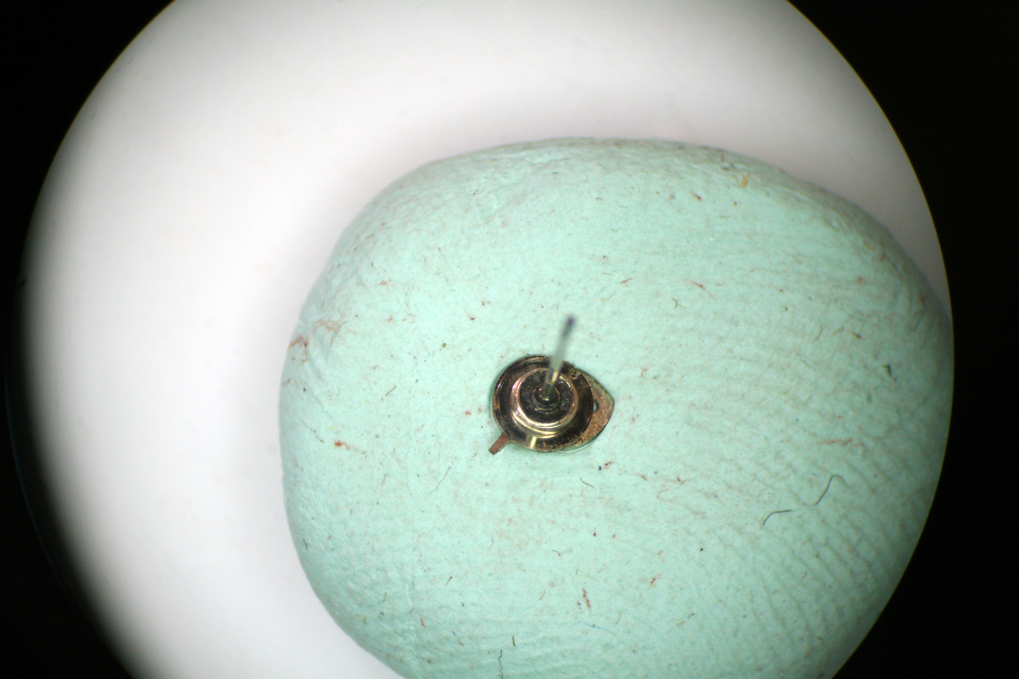 Painting was done under the microscope with a small oiler and a vial of Testors flat red model paint. Twenty-four hours of curing time was given before the hand was ready for installation.