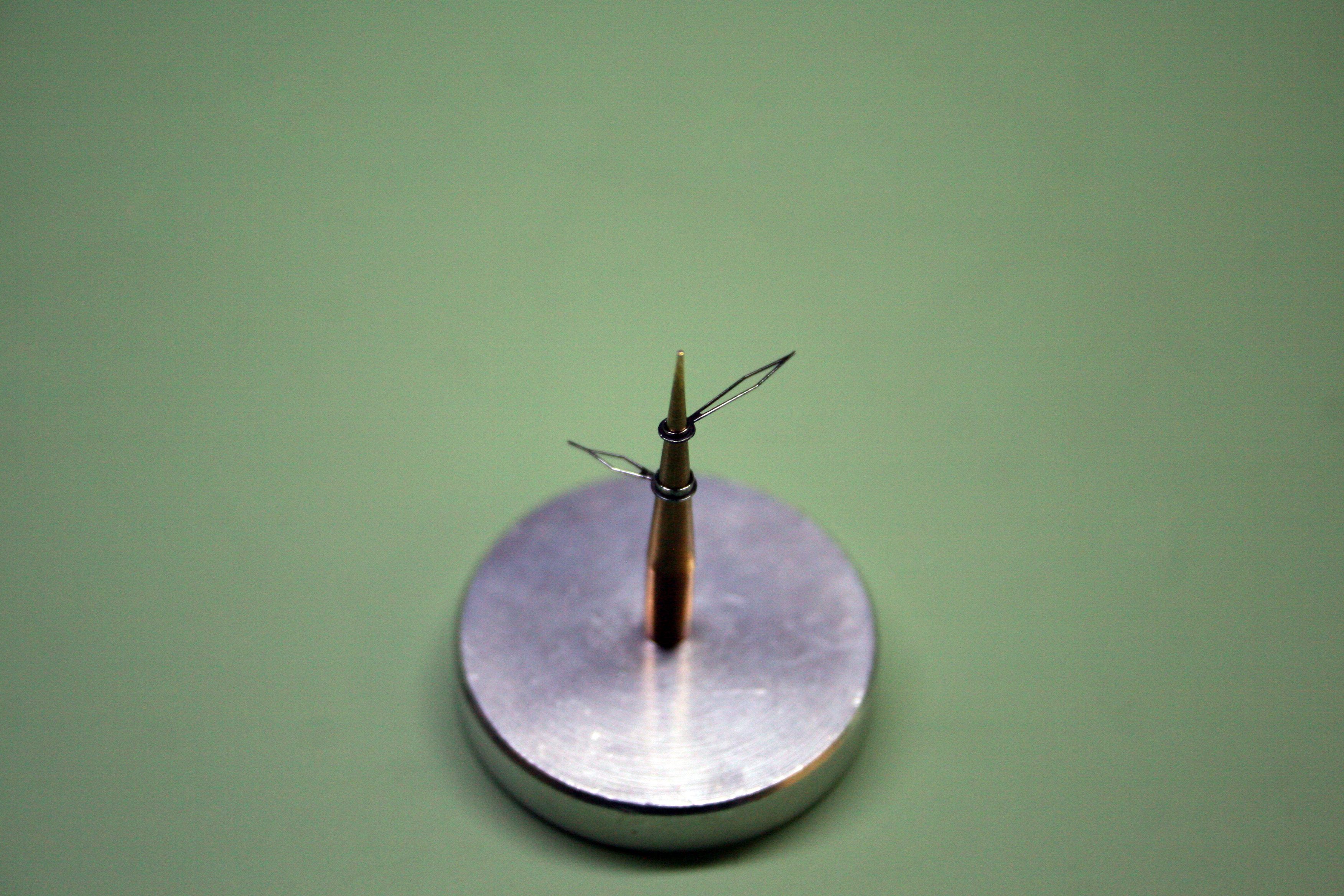I reduced the width of the rod to 2.1mm then severed the end with a graver; this would serve as the replacement clutch plate. Since the plate needs to be almost perfectly flat, I secured the severed bit to a brass plate with warm shellack then flattened the disk with a small file.