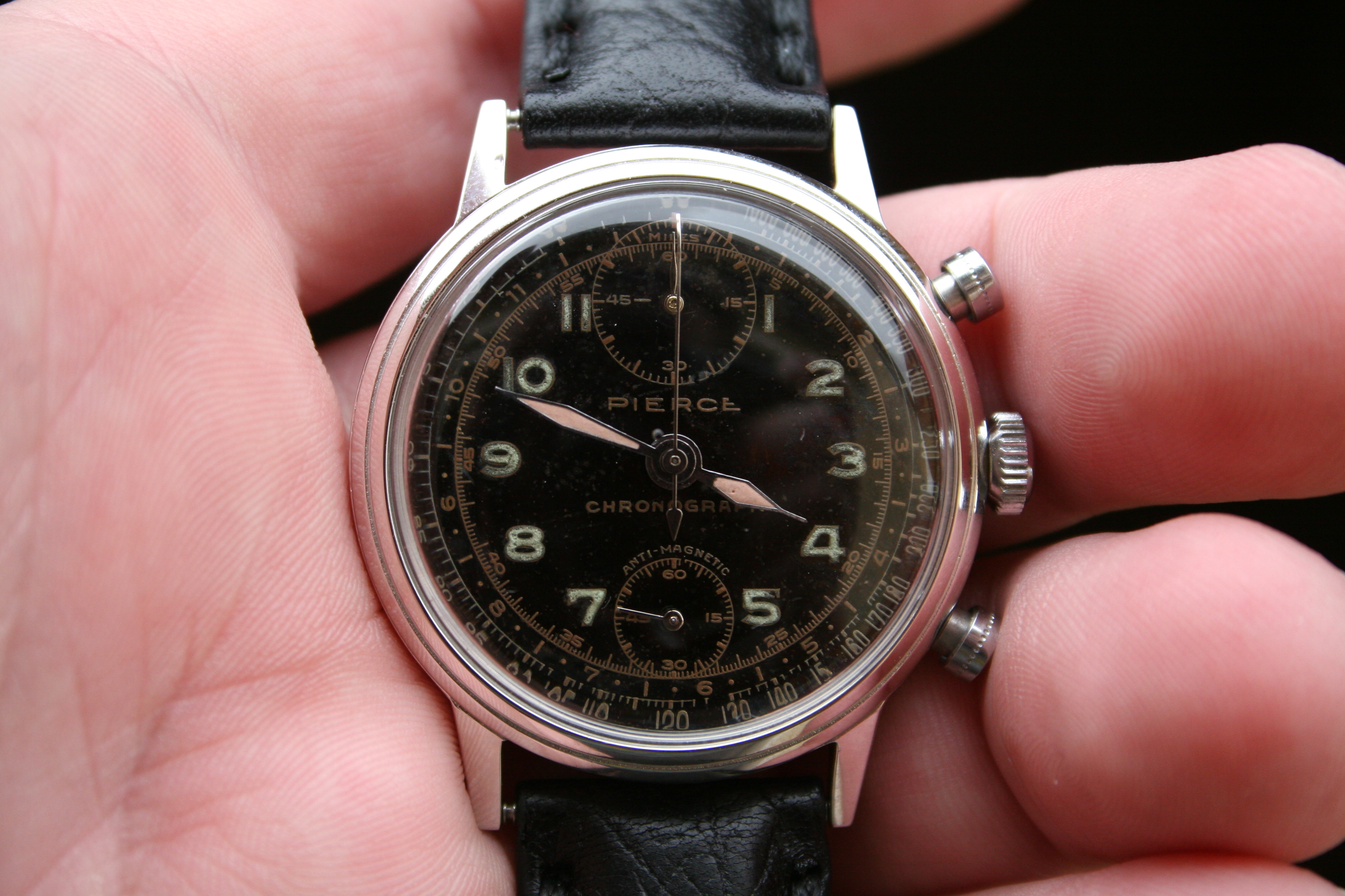 In going through a dusty box of old stuff, I came across a Pierce chronograph that (to my untrained eye) looks exactly like the one you show here. The crystal is cracked (on the edge in one spot) and scratched, but the timekeeping function seems to work. The chronograph buttons are sticky. Would you be able to give me a rough estimate of what it might be worth? I would be happy to send pics. …j