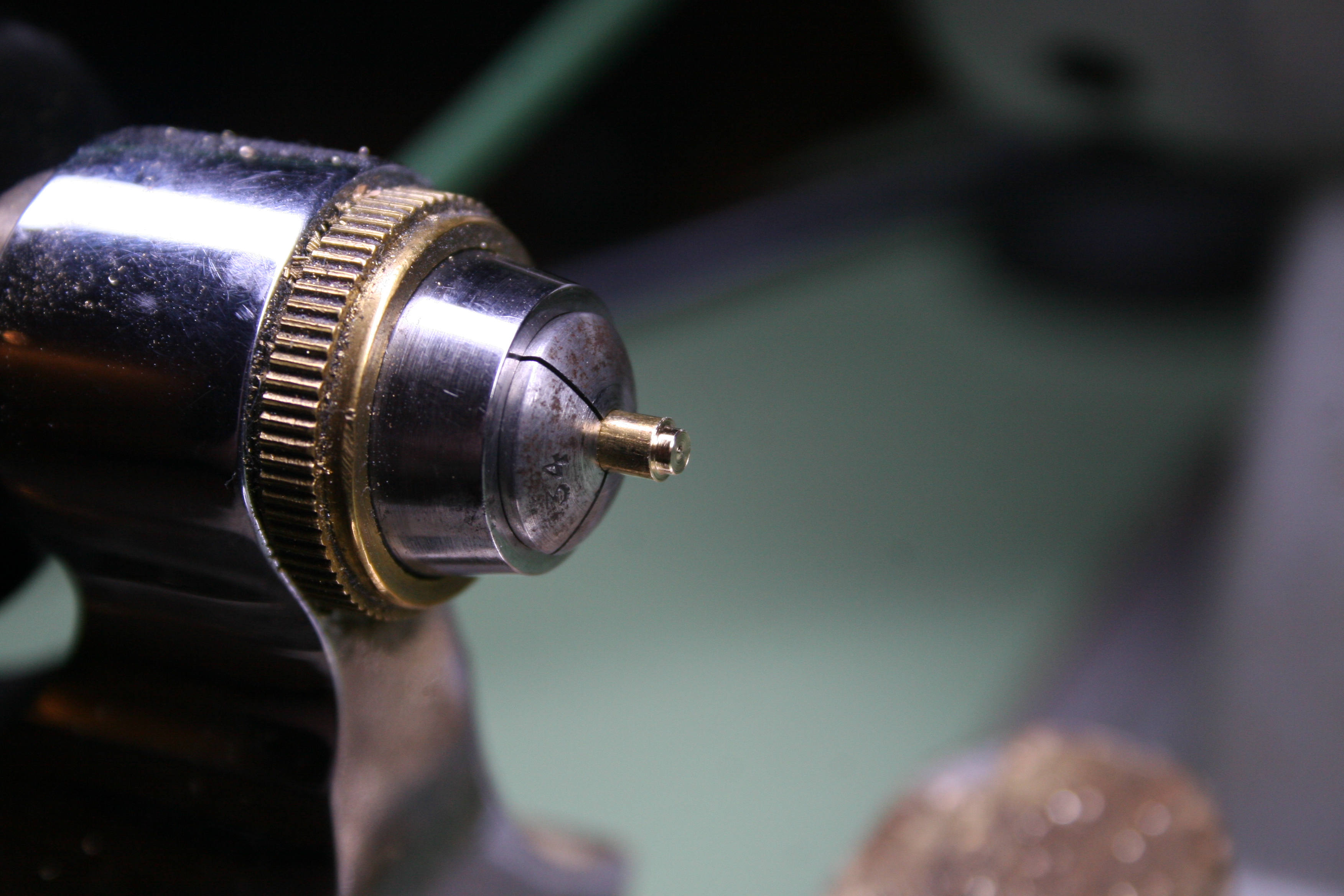 Plan B was to turn a nut and washer on the lathe and use a 1.4mm case screw to fix the fastener back in place. The nut was turned using some brass stock that was about 3.5mm in diameter.