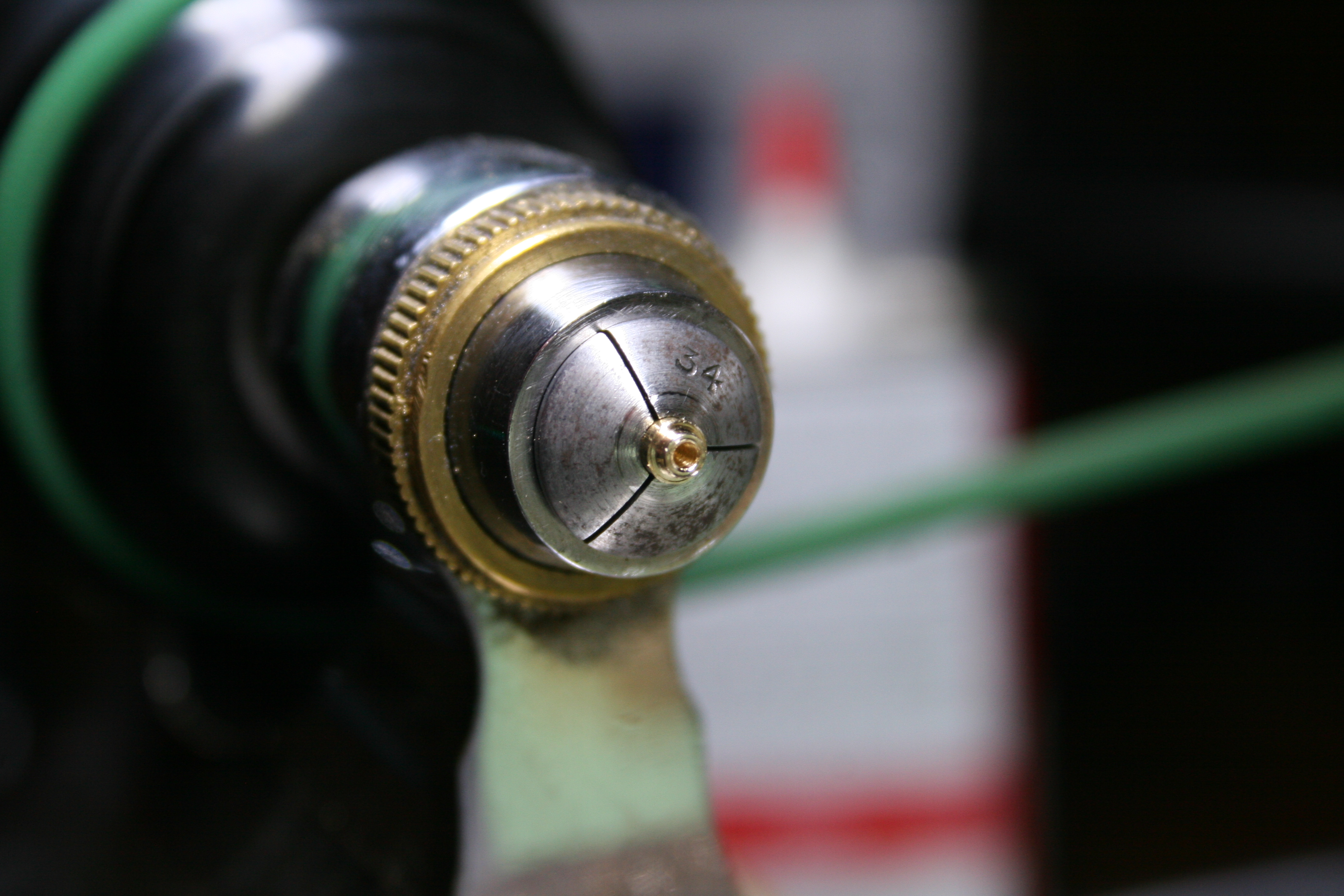 The rivet which had failed is a tiny pop rivet about 2mm in diameter. I wouldn’t be able to place a new pop rivet without removing the cam which was soldered to the motor shaft. Fortunately my father still had the original rivet; I tried working it back into the hole and flaring the end but there just wasn’t enough material left to make it work.
