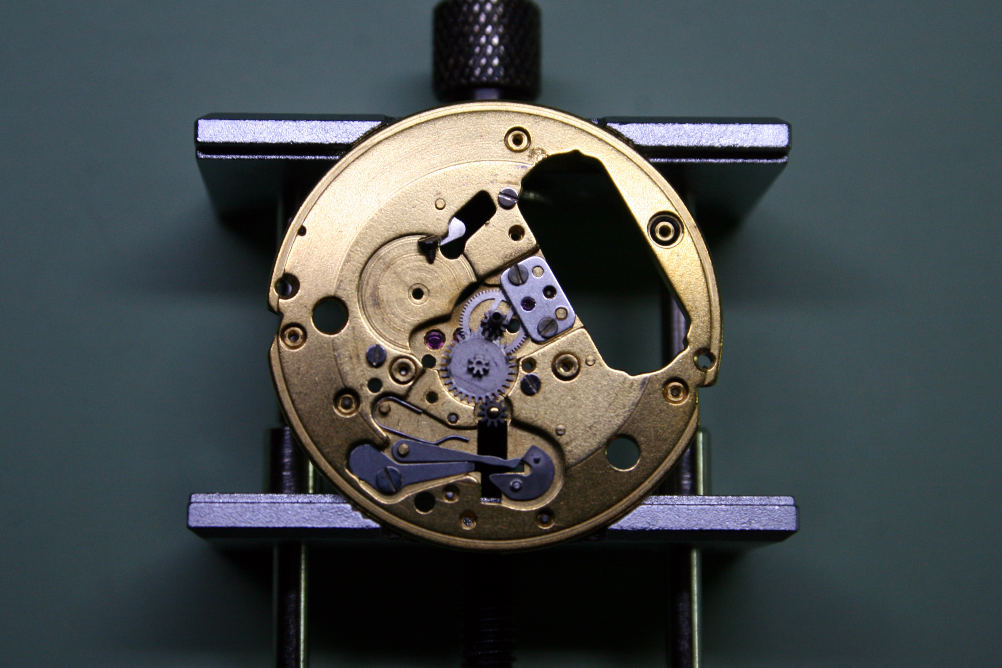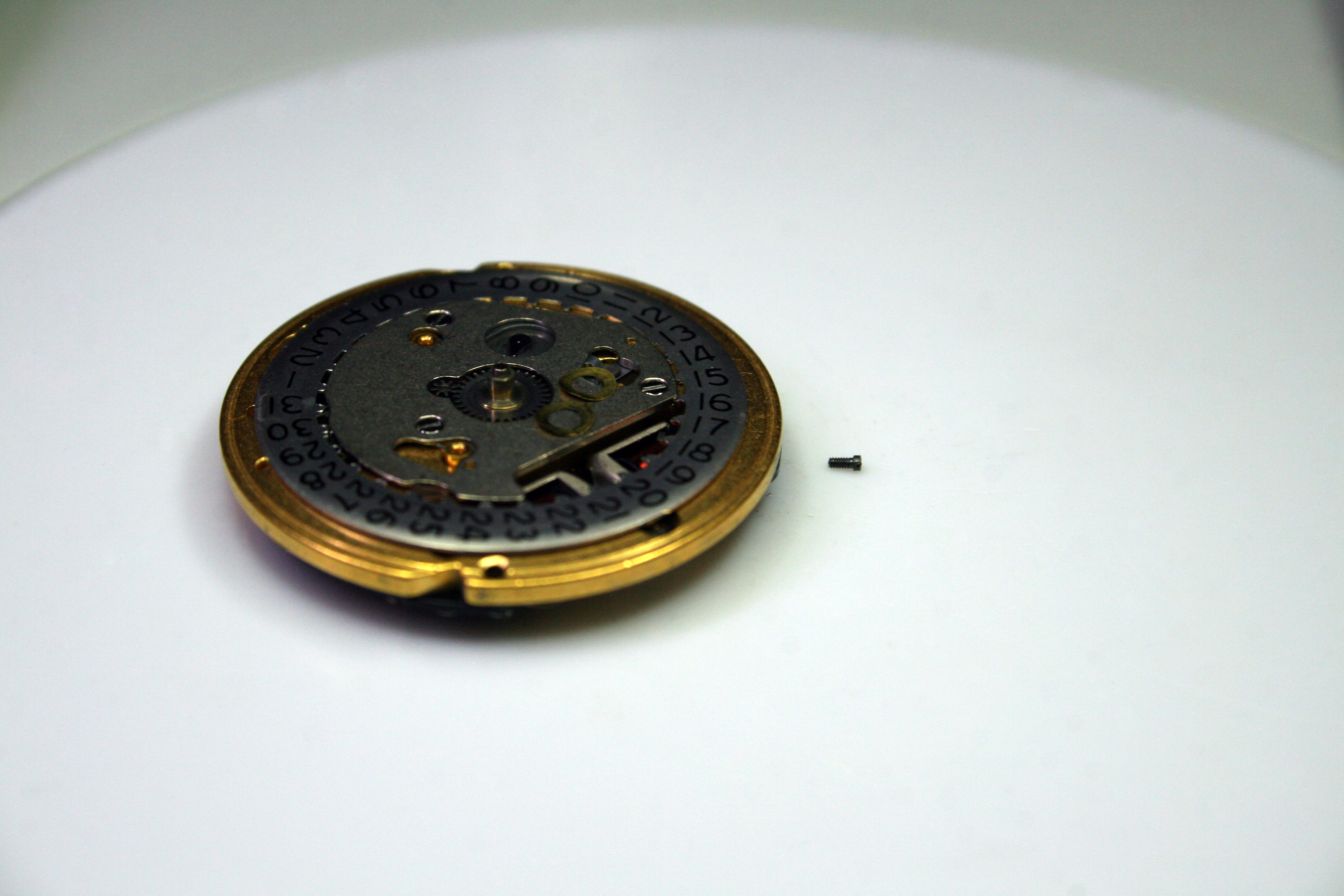 With the base movement reassembled it was time to get onto the date mechanism. Reassembly was the reverse of disassembly but it still proved difficult as there were two springs to set. Sadly for me, I didn’t realize the date mechanism was covered in the back of the service manual (let that be a lesson to all to read cover-to-cover) and as a result I thought the date trip spring had to be placed under tension before the date bridge was screwed down; the spring shot away from the movement (repeatedly) until it was lost.