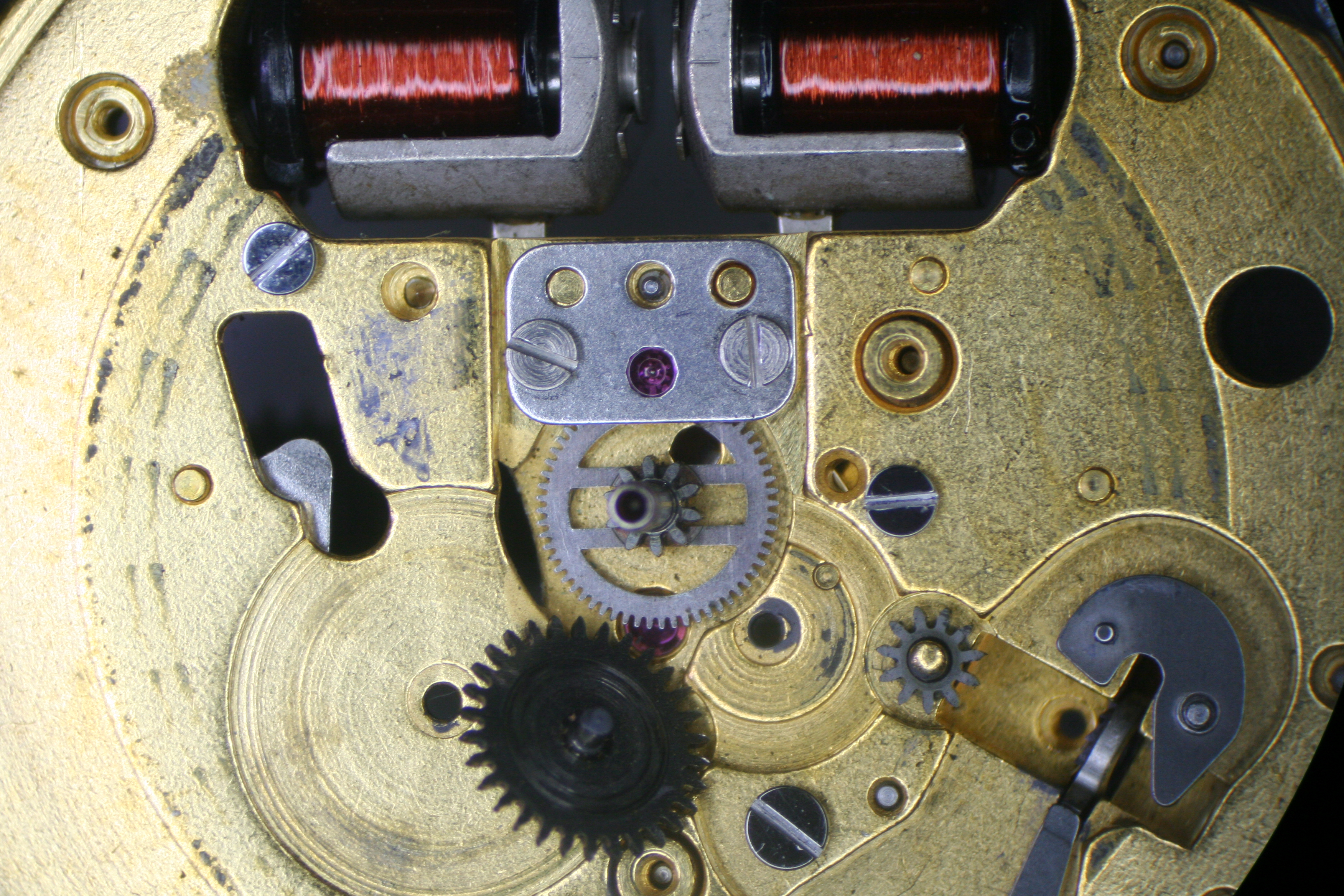The tuning fork was assembled with the coils under the microscope before being secured to the plate. In the picture below you can see the jeweled finger which contact the index wheel with each vibration of the fork- it’s quite small and exceedingly delicate.