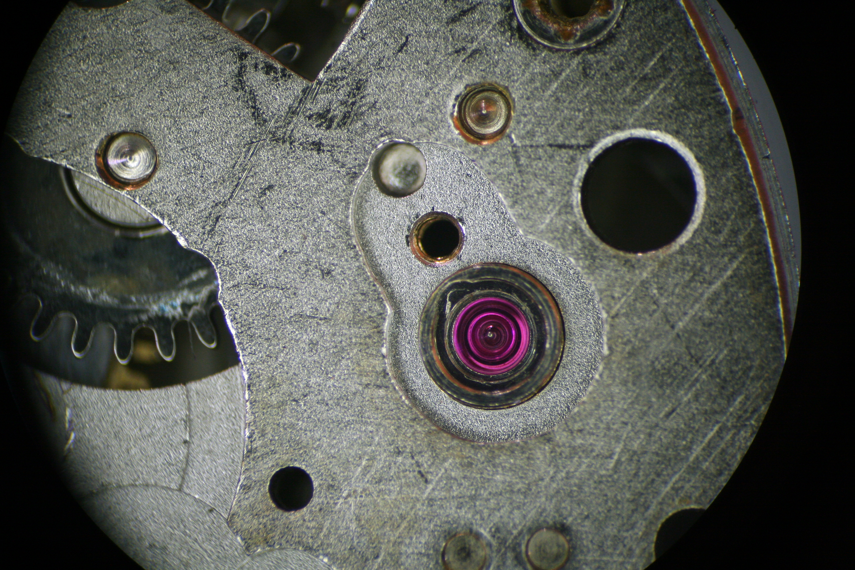 It was now time to deal with the cap jewel. This movement is a single jewel movement; the pivots for the balance wheels rest on brass bearings and the lower pivot is capped with a disk of polished steel. The top pivot is capped with a standard ruby cap jewel, but the shock spring is a pain to replace. Fortunately harsh language seemed to do the trick.
