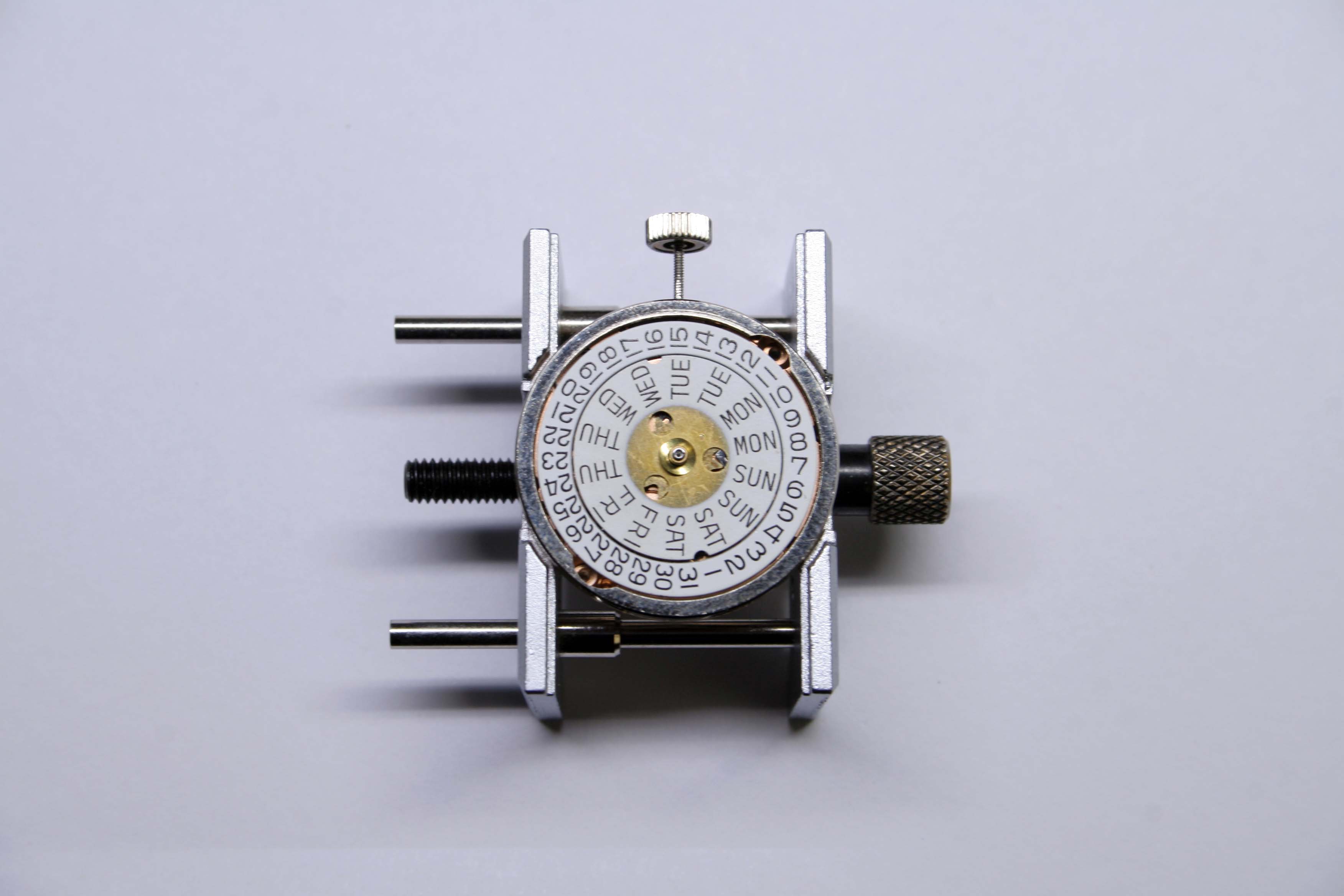 Before removing the automatic works and gear train, the calendar works needed to be broken down. I flipped the movement over and removed the dial to reveal the day and date disks.