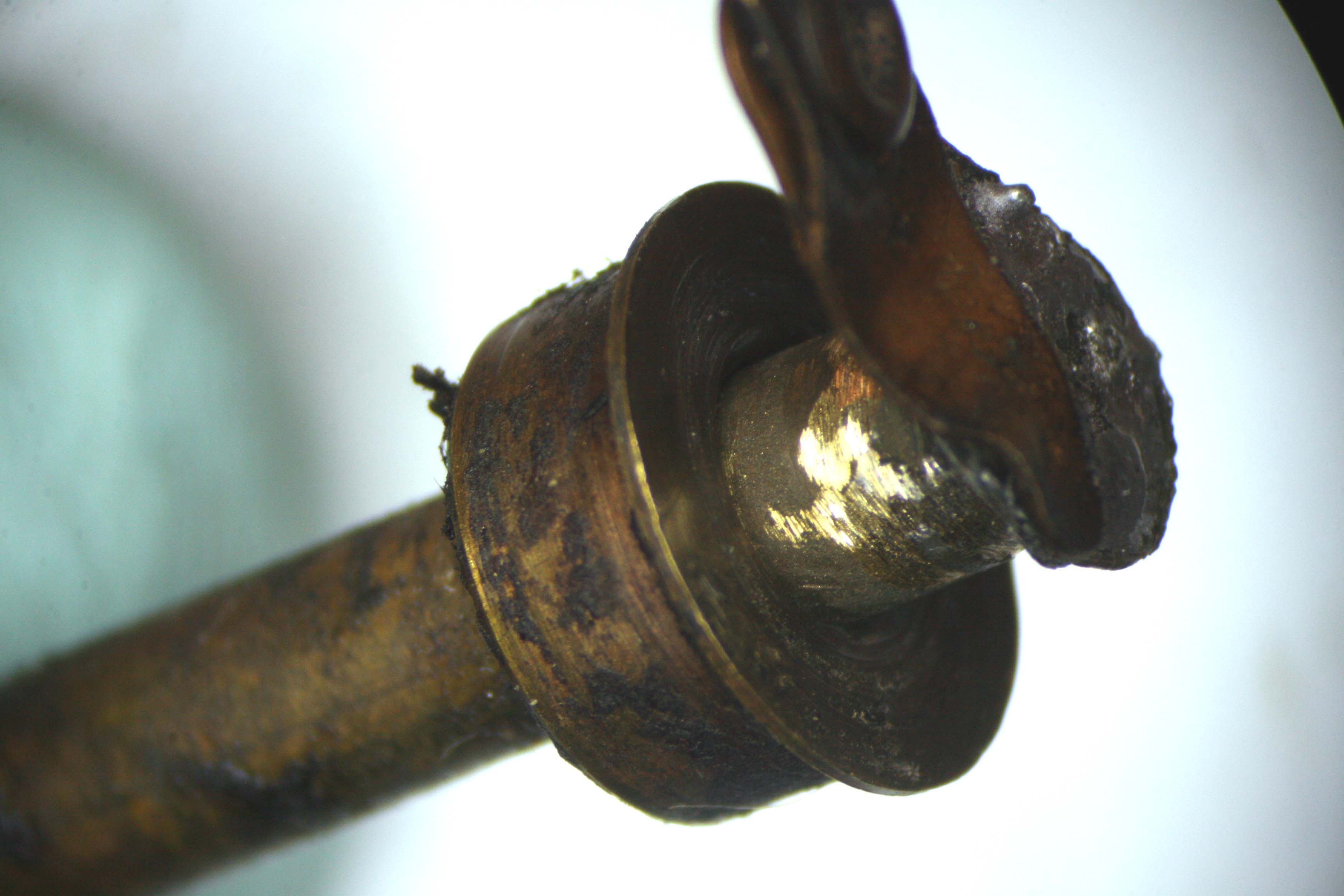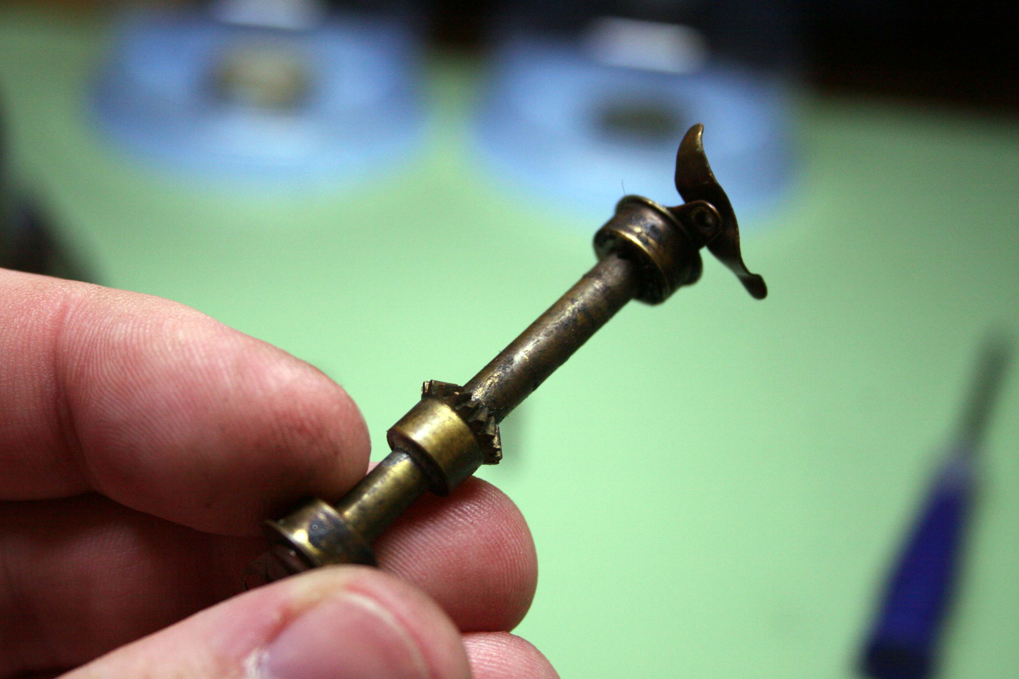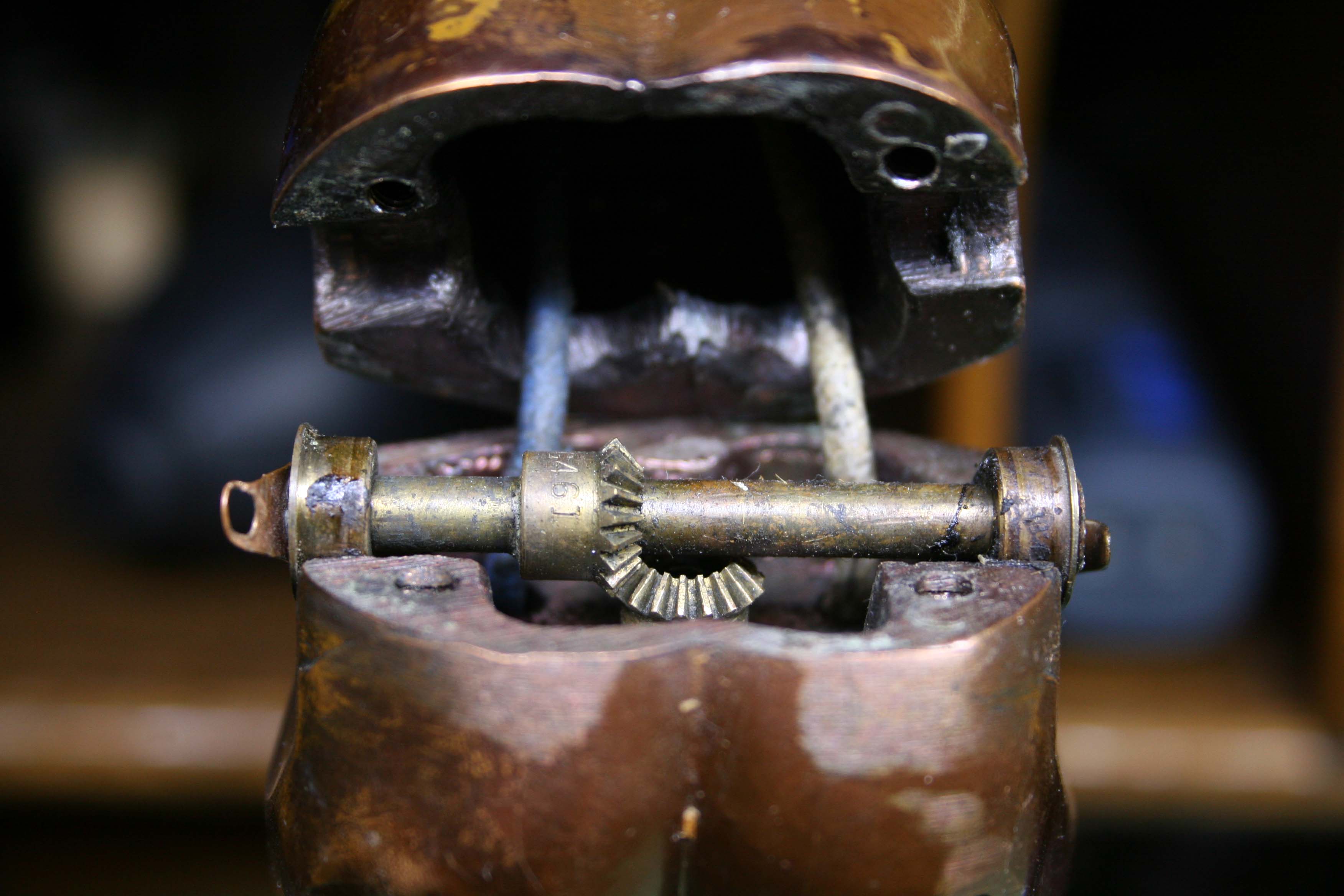 Under close inspection I could see that some work had been performed here in the past. One of the cams, which are soldered to the crank, had been removed before, probably by grinding away the solder. That had resulted in heavy scoring of the brass crank shaft right where it passed through the bearing.