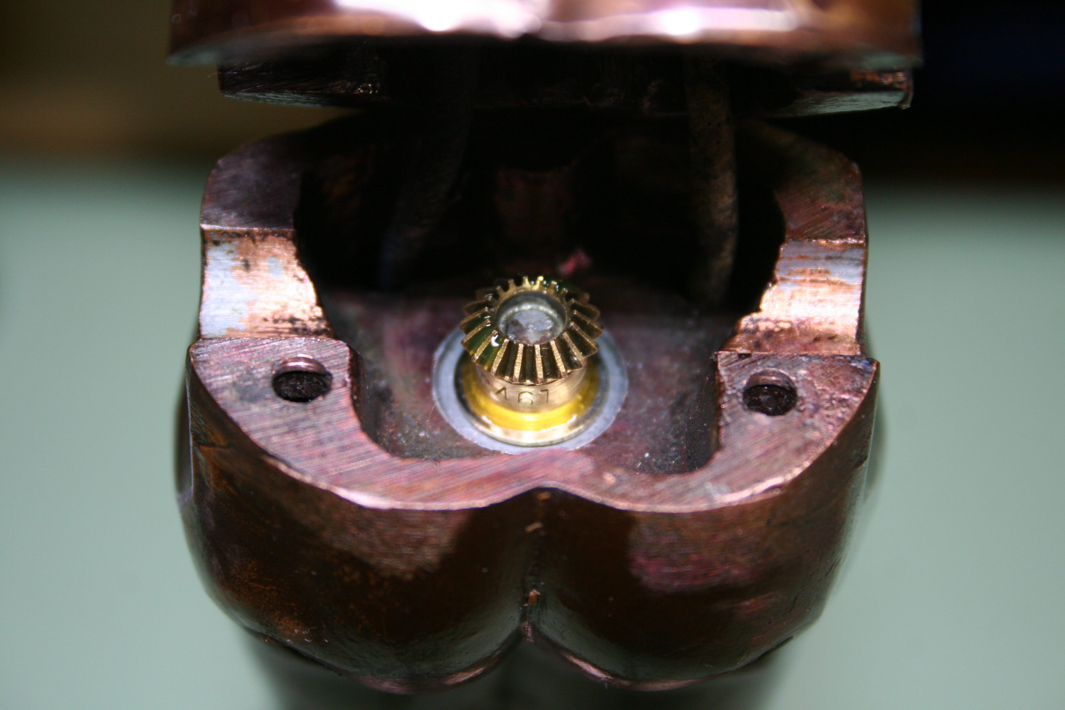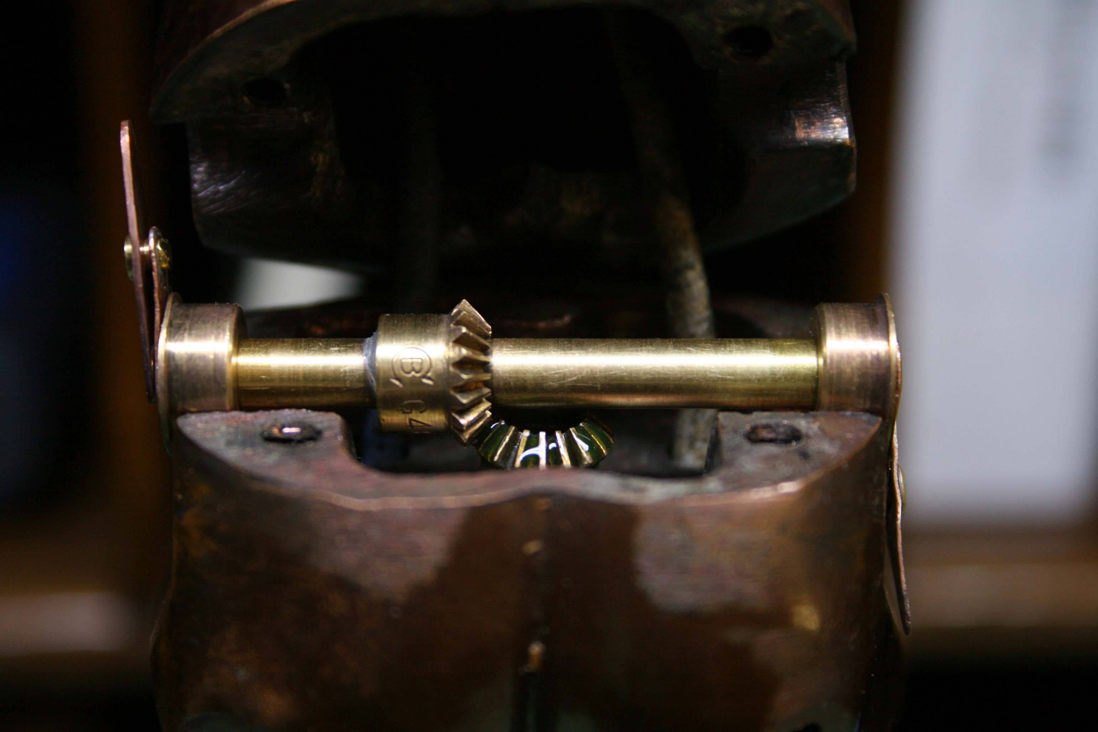 Upon returning to the lamp I discovered a new problem which wasn’t apparent earlier. The bushing for the longitudinal shaft (from the motor up to the crank) had become loose and the slack was enough to keep the gears from meshing. Sometimes this would cause the the whole works to seize up.