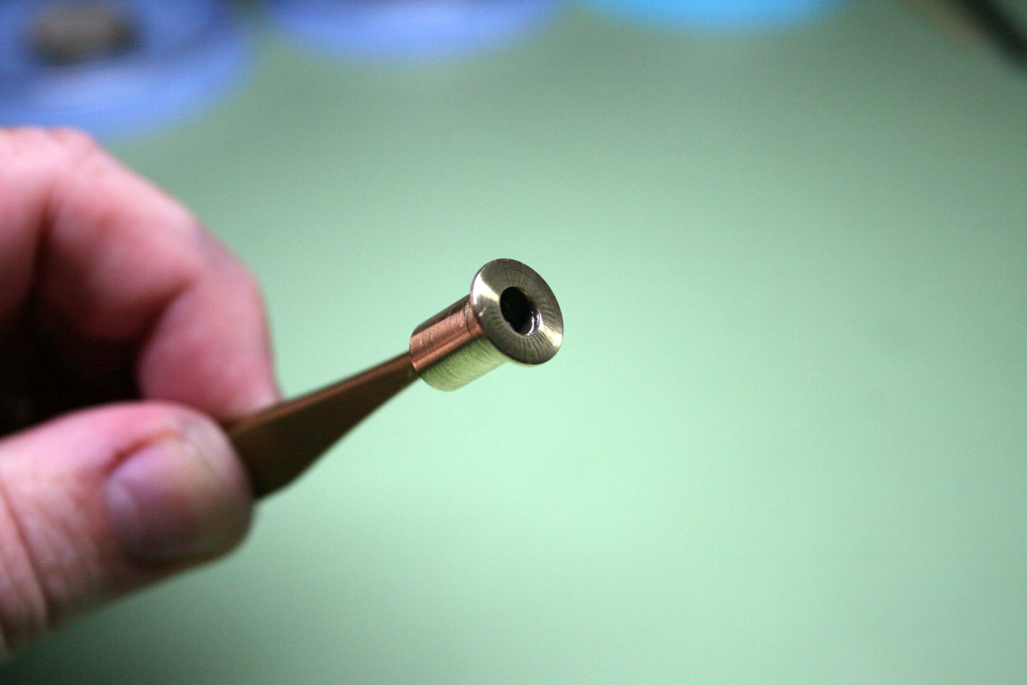 Plan B was to solder a small brass washer to the top of the original friction fit bushing. The washer would work as a flange and hold the bushing in center.