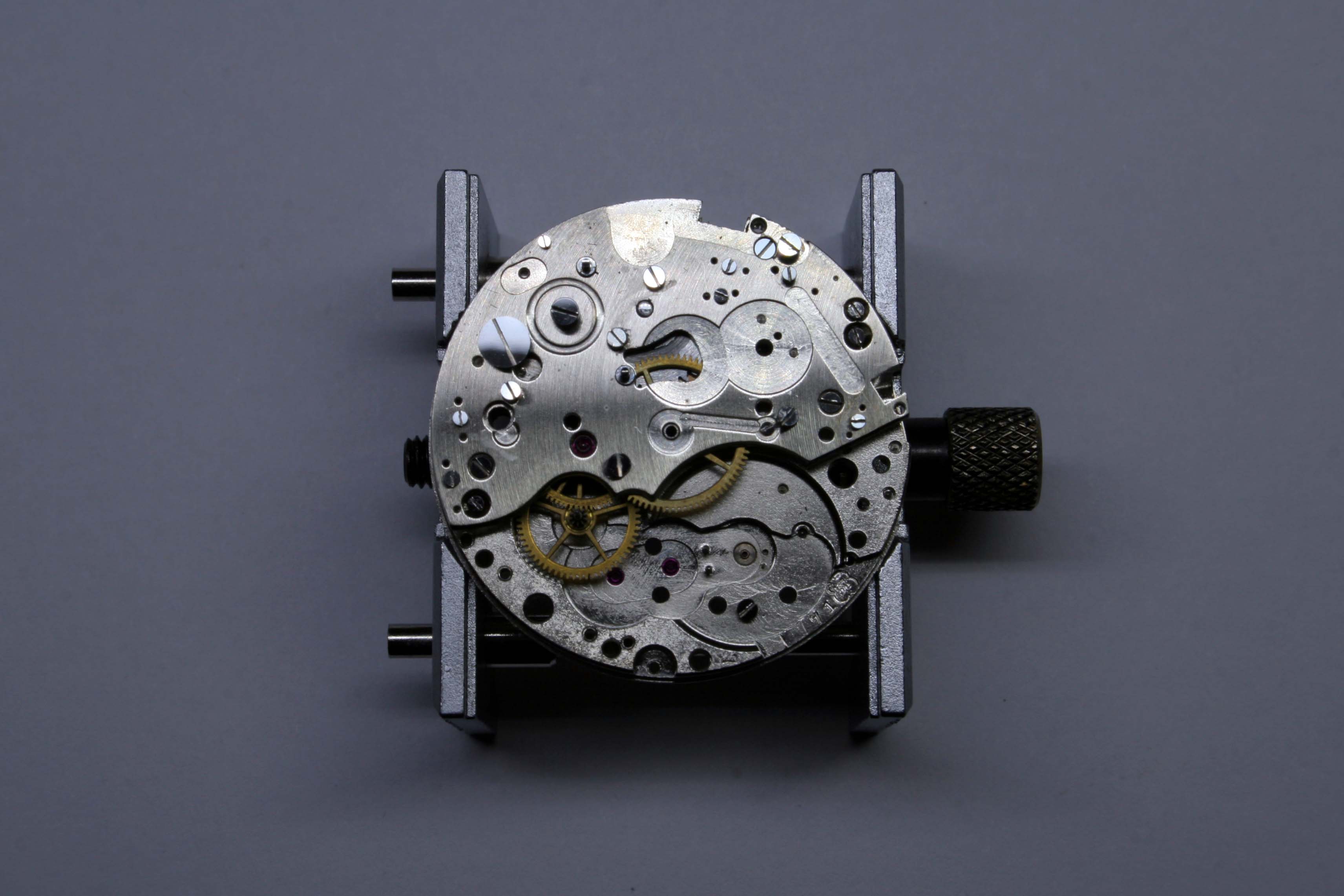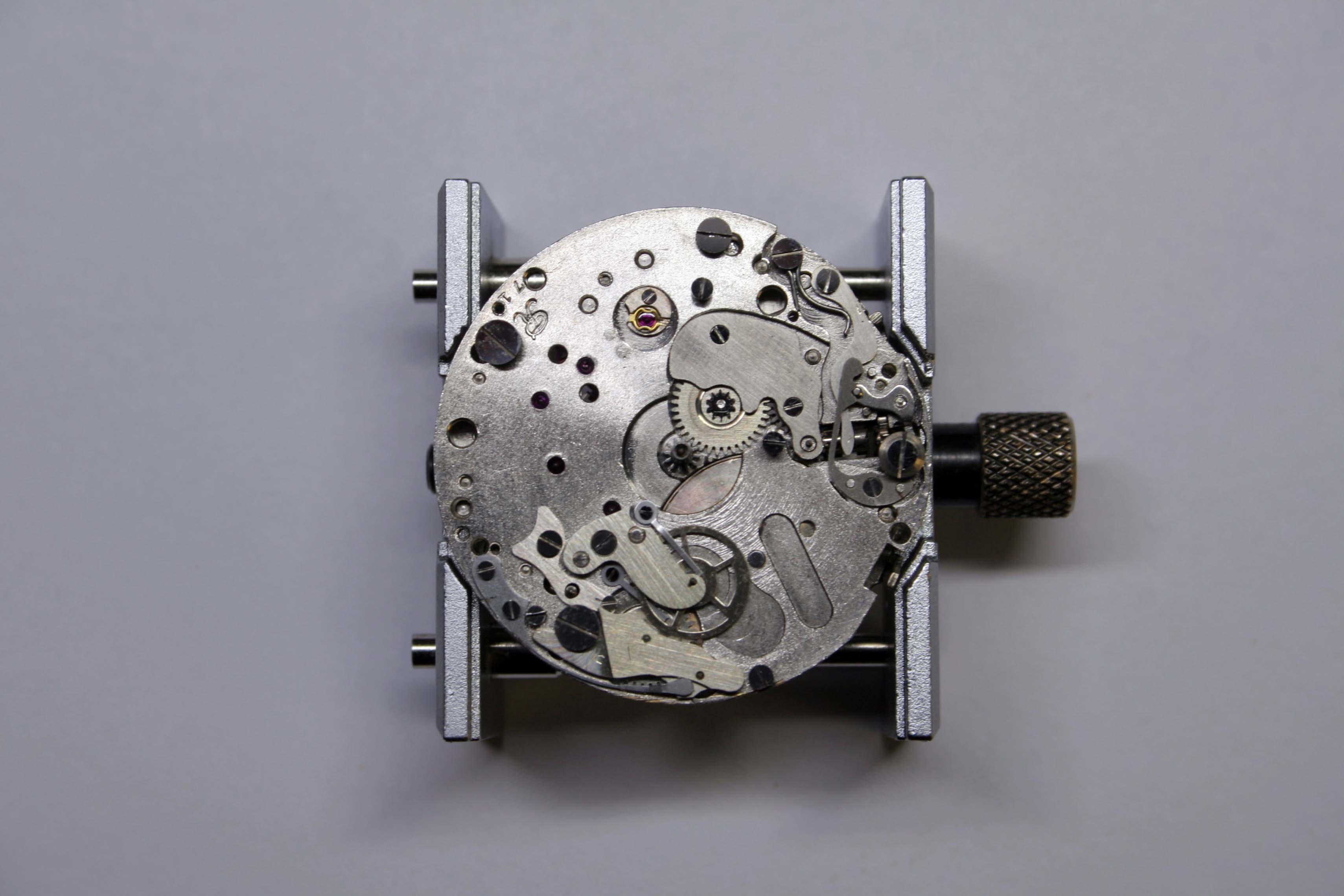 As the gears, levers, and springs of the chronograph came away I could examine the pivots and jewels for damage or wear.