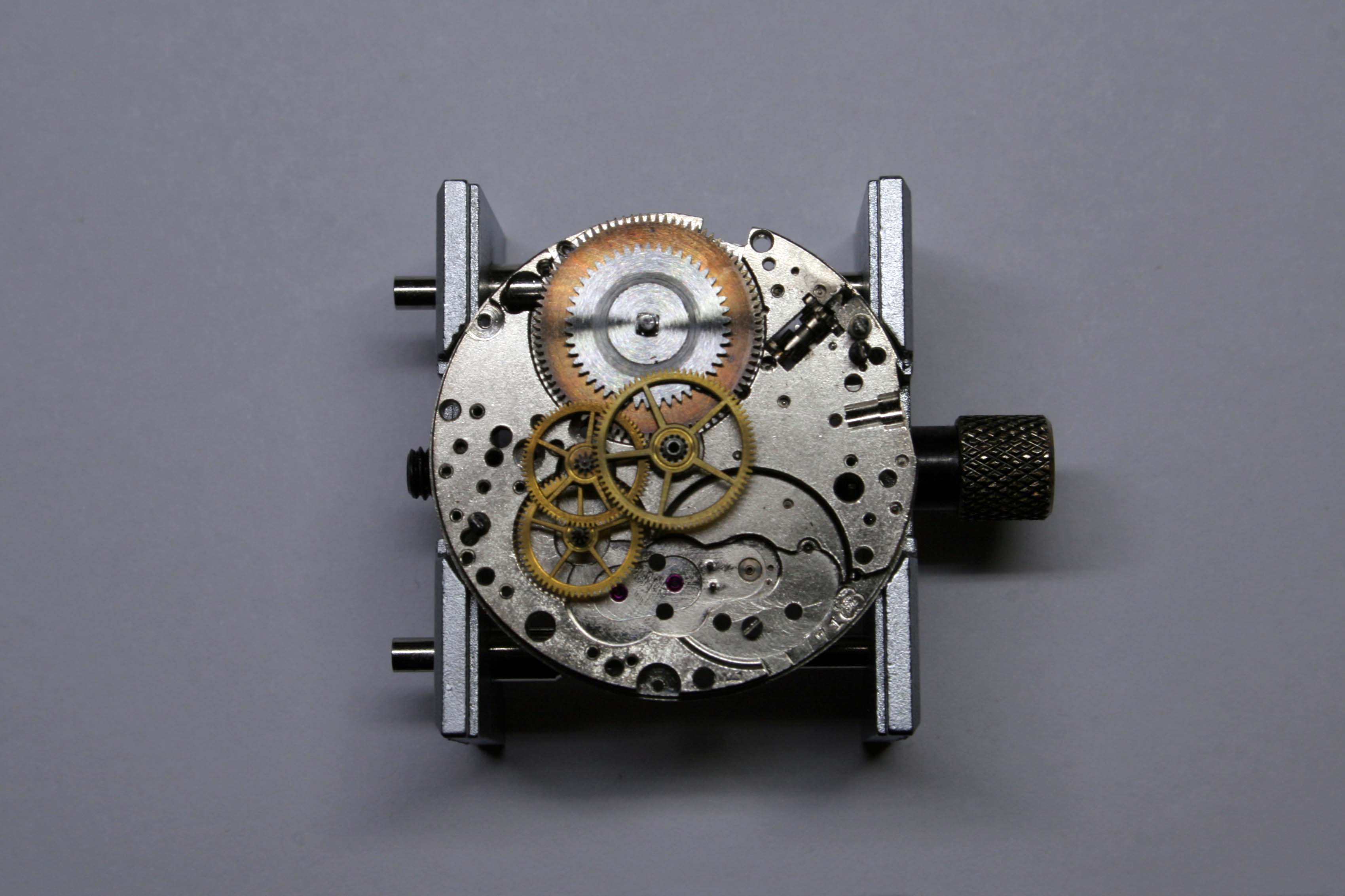 The chronograph works were assembled in reverse order again using the Esembl-O-Graph guide.
