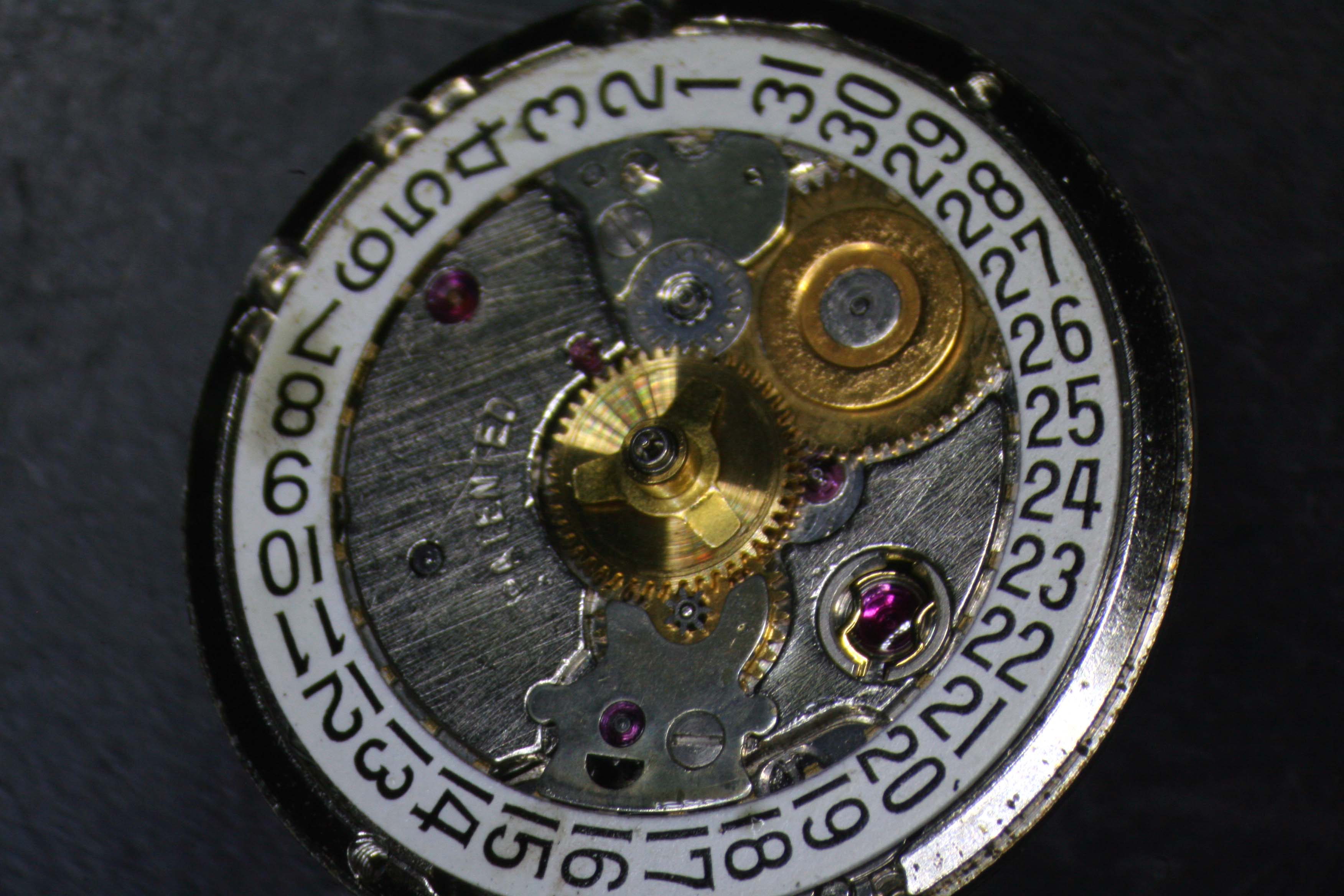 Removing the hands and dial exposed the calendar works which was heavily lubricated with thick watch oil. Puddles of oil appeared even on the calendar ring which is quite unusual as excess oil is about as detrimental to a watch movement as lack of oil.