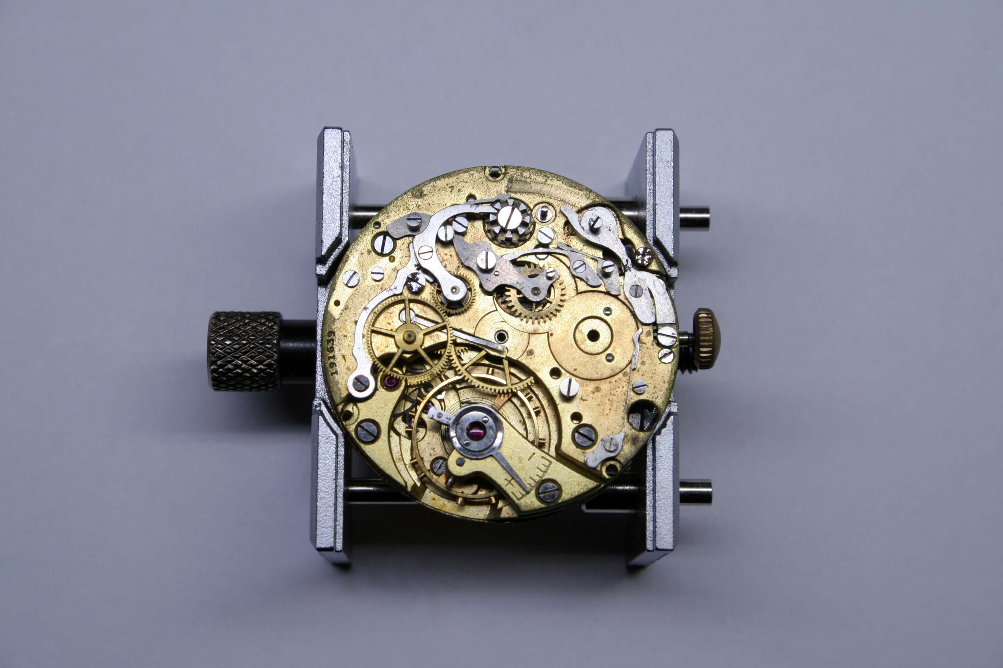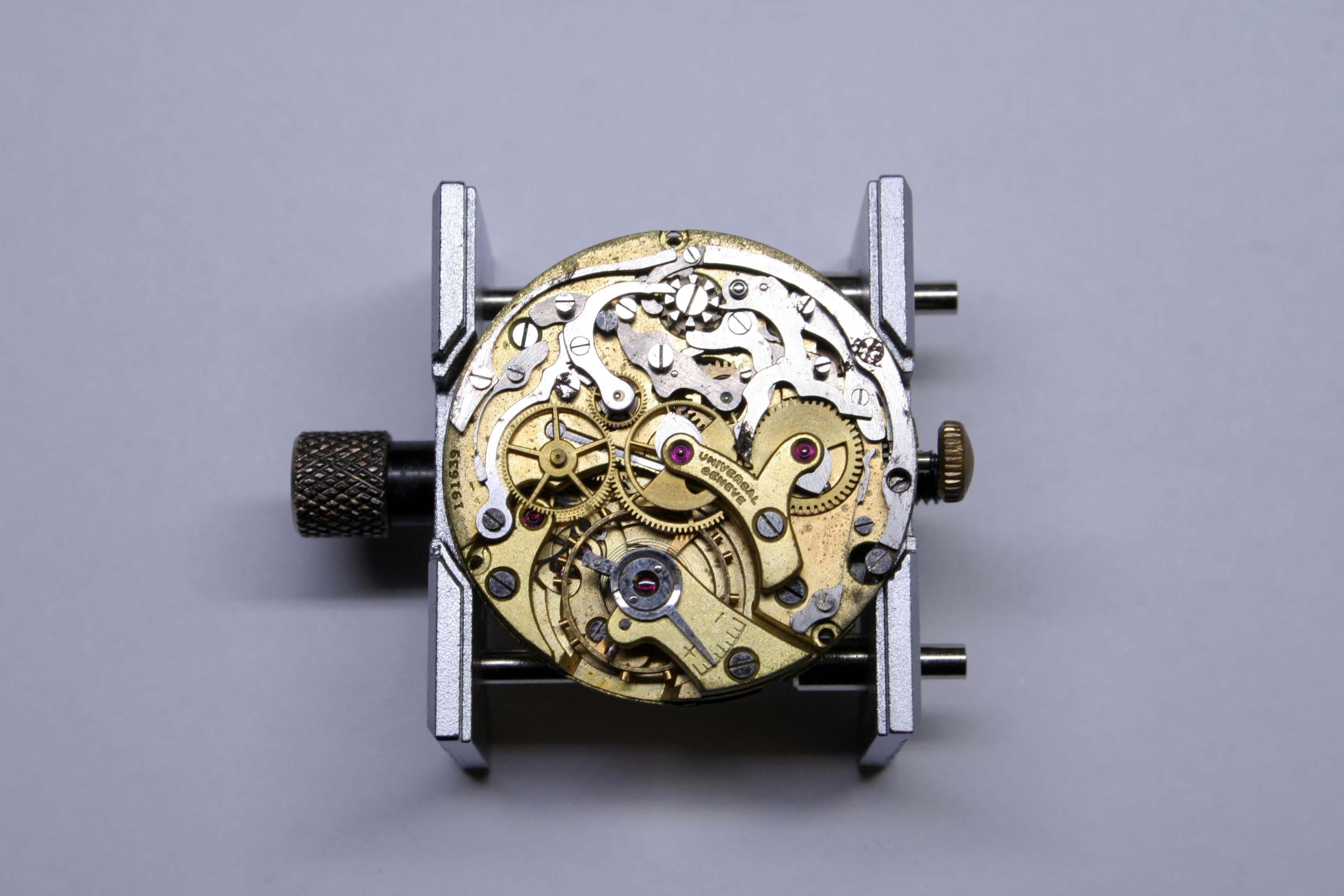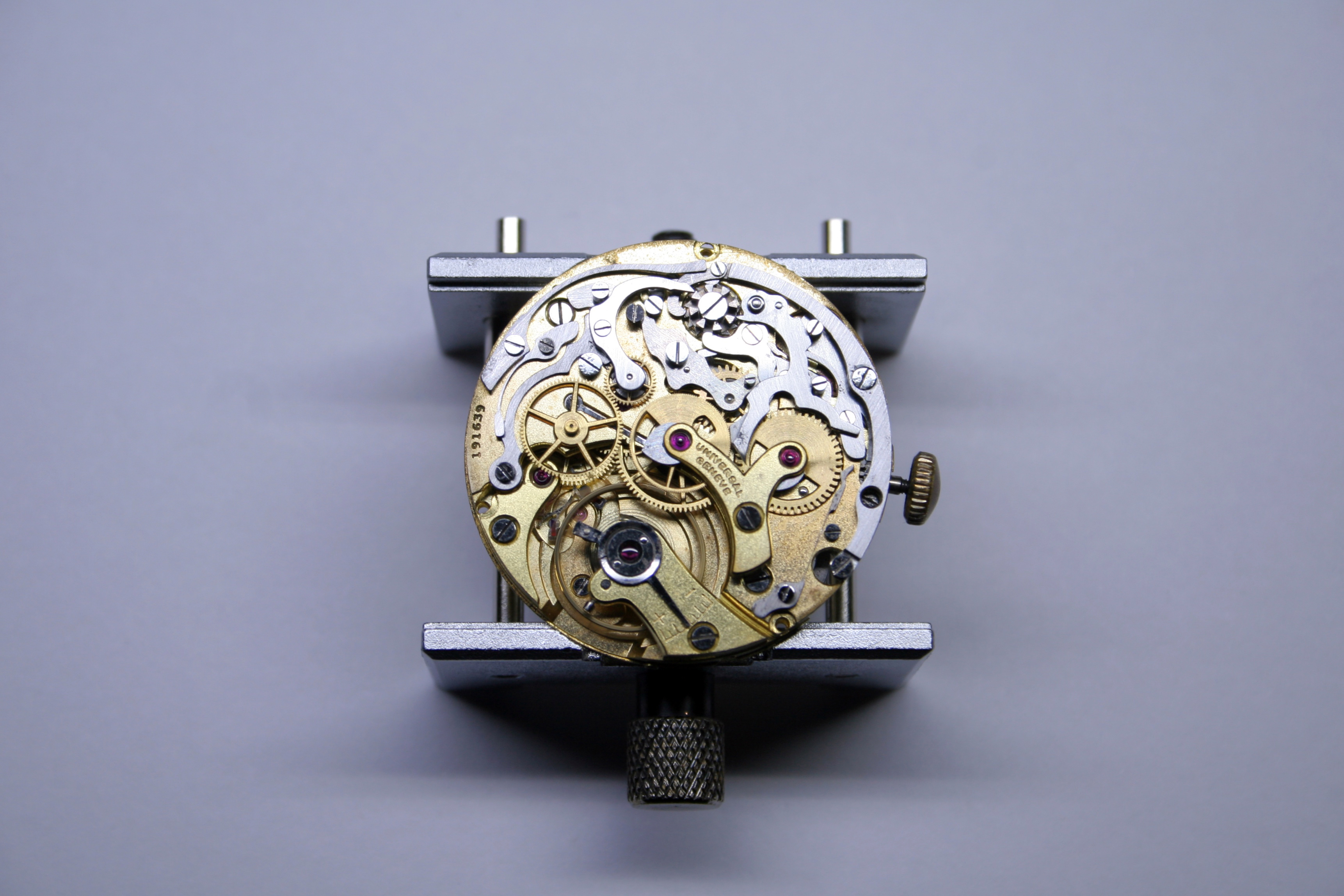 Here is what I consider to be a very special piece even though it’s missing some of its most important bits. This is a Universal Genève Uni-Compax chronograph from around 1942. The movement was most probably fitted in a solid gold case which at some point went to the smelter and may not be replaceable. Regardless, I was excited to get my hands on the piece because it’s a chronograph movement I’ve not worked on before.