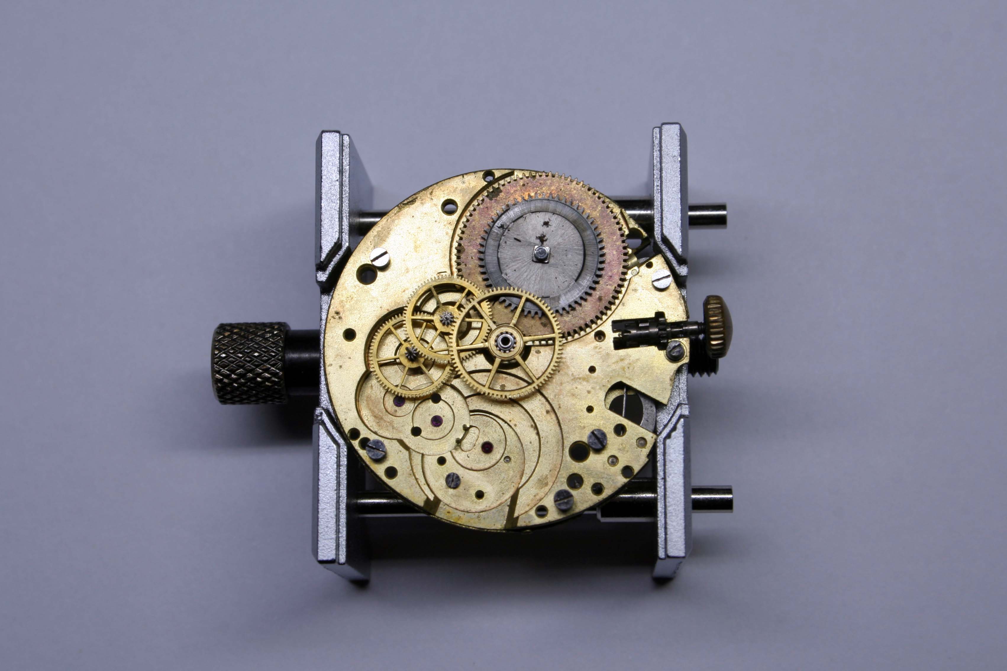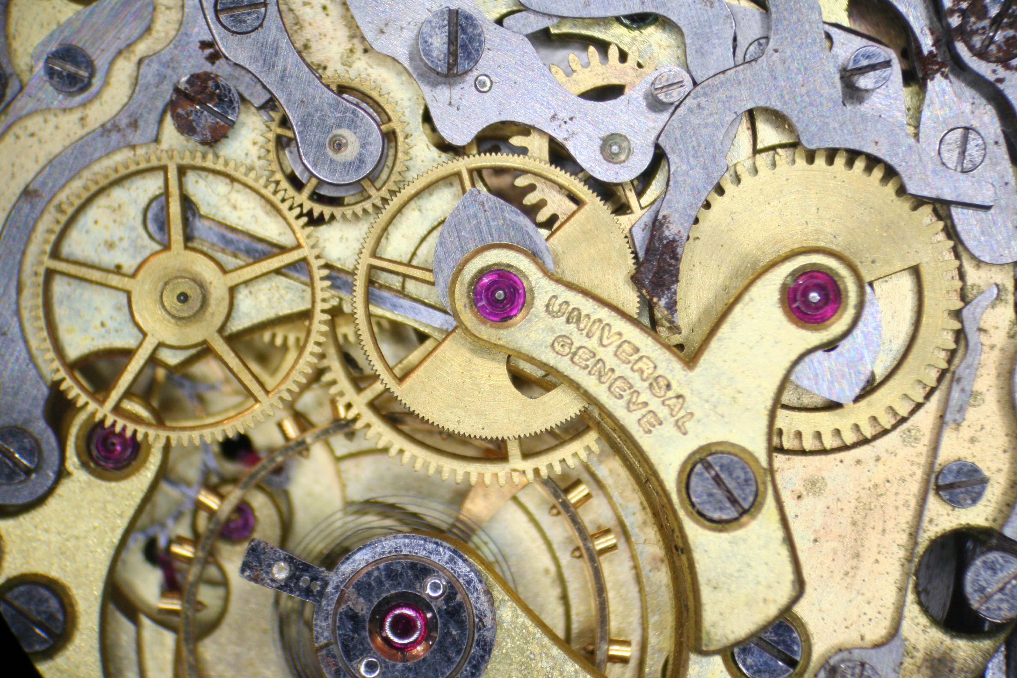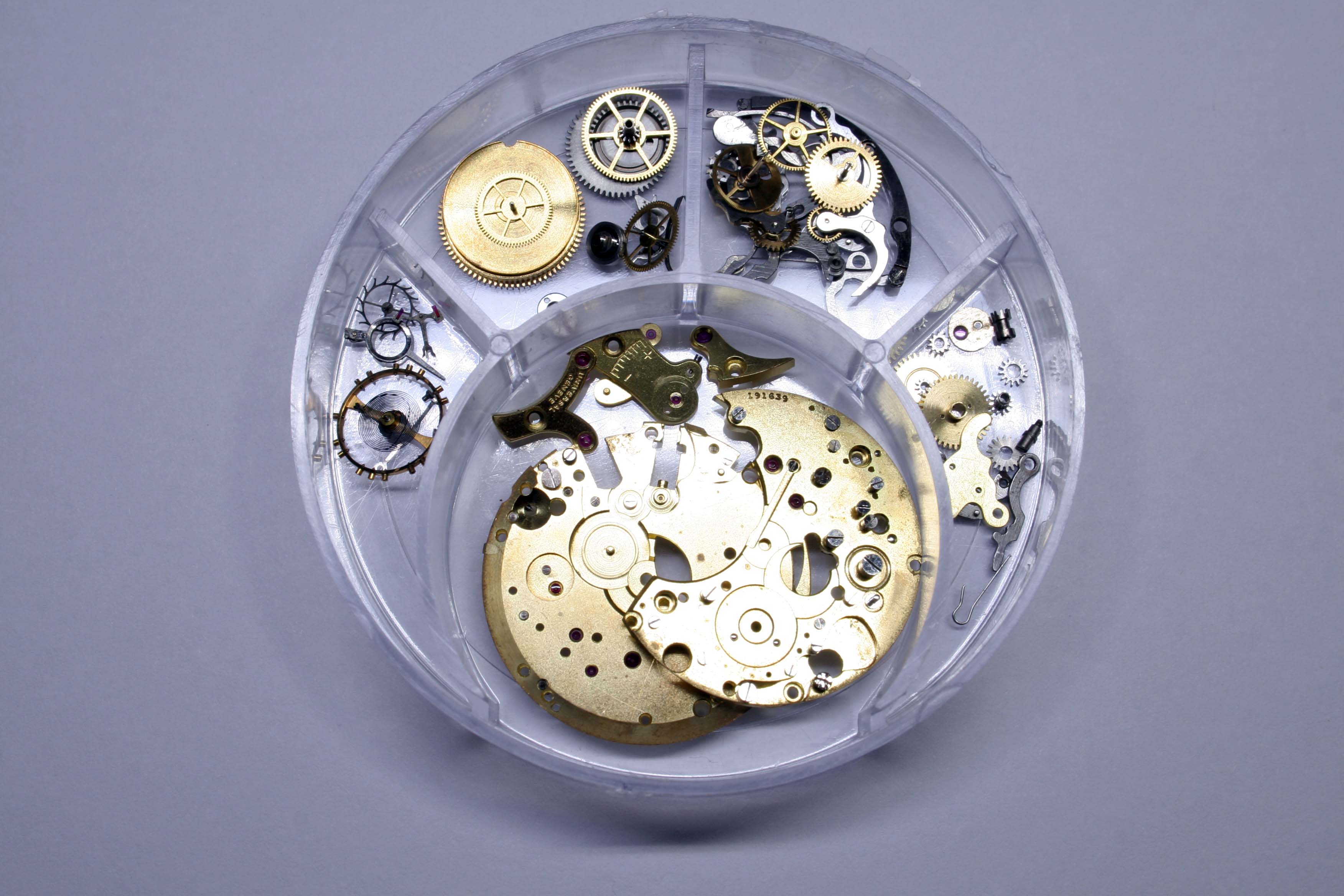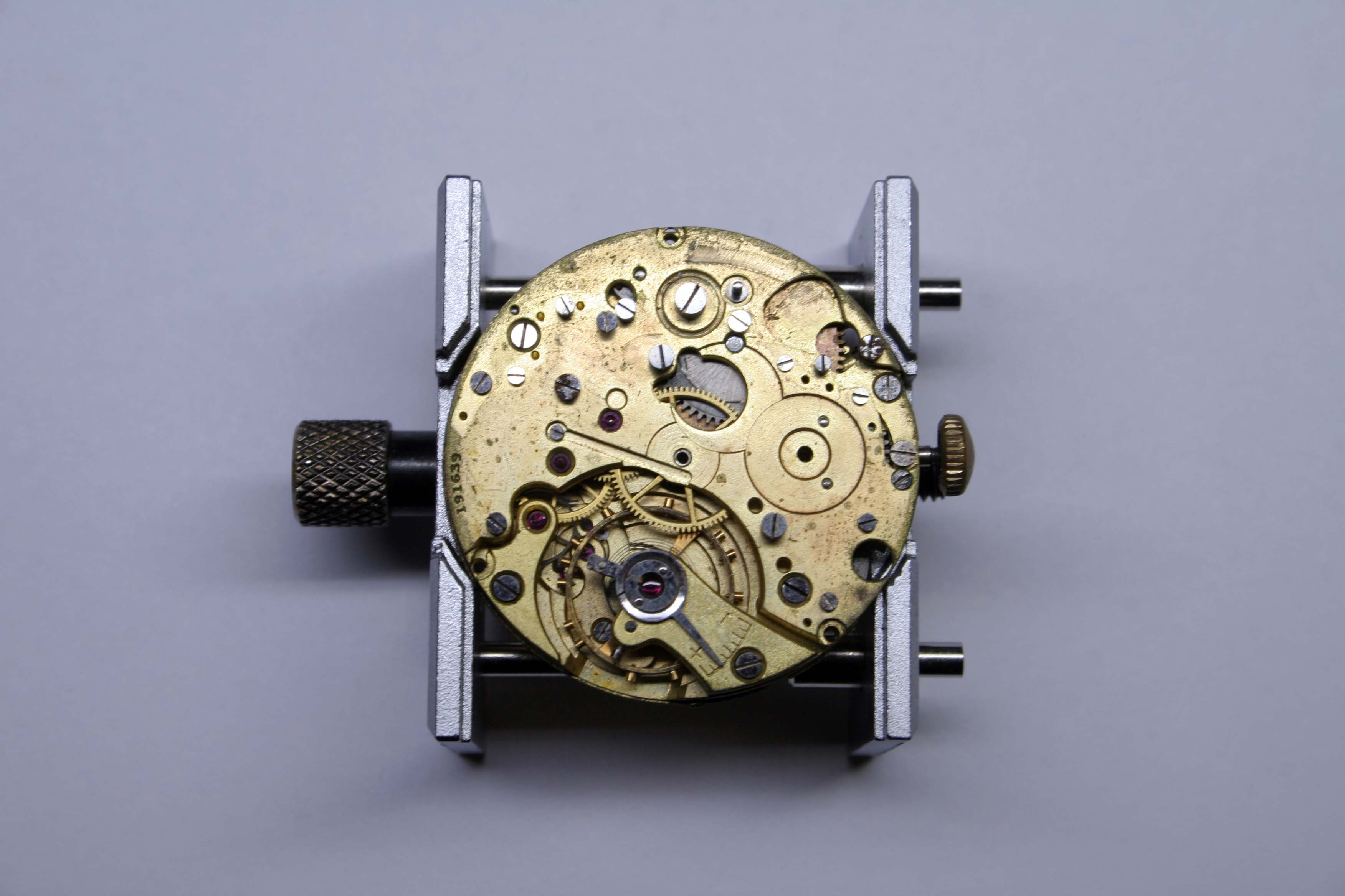 Here is what I consider to be a very special piece even though it’s missing some of its most important bits. This is a Universal Genève Uni-Compax chronograph from around 1942. The movement was most probably fitted in a solid gold case which at some point went to the smelter and may not be replaceable. Regardless, I was excited to get my hands on the piece because it’s a chronograph movement I’ve not worked on before.