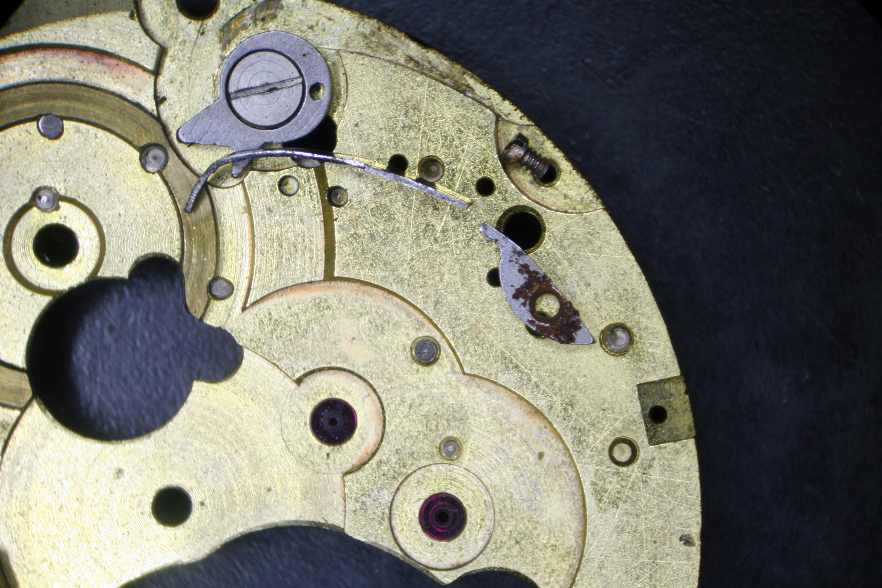 Now satisfied that this movement has a bit of life ahead of it, I set to work on the chronograph mechanism taking a bit of extra care when removing rust, polishing screws, and regraining the steel levers and springs.