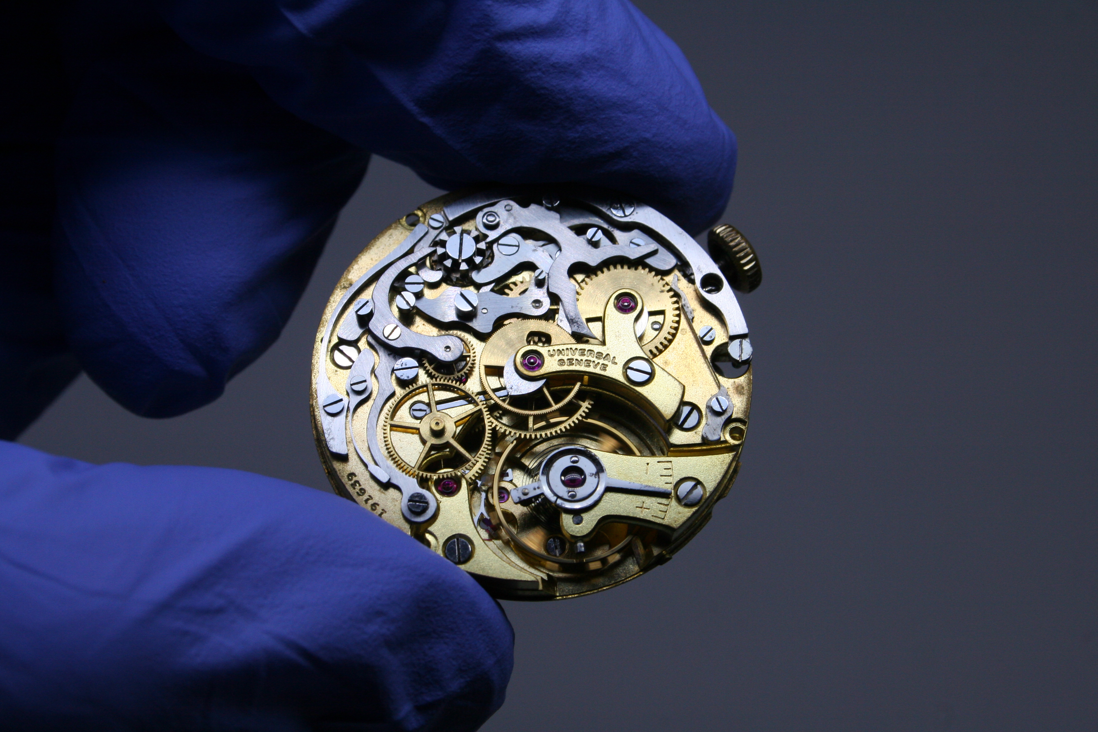 Having completed my first Universal chronograph service I can now compare the movement to some of the chronographs I’ve worked on before. I’m impressed with Martel’s work. The engineering of this movement and the finishing are certainly on par with Venus, Valjoux, and Lemania. I particularly like the fact that there is only one wire spring in this whole movement (all the rest are milled steel). A lot of time went into its production and it’s a shame the case and hands have gone missing. Lastly, I am particularly enamored with the gold plating. Gold plated watch movements are quite uncommon and that alone makes this one feel special. A look back at Universal’s back catalogue suggests this was the norm for their chronographs.