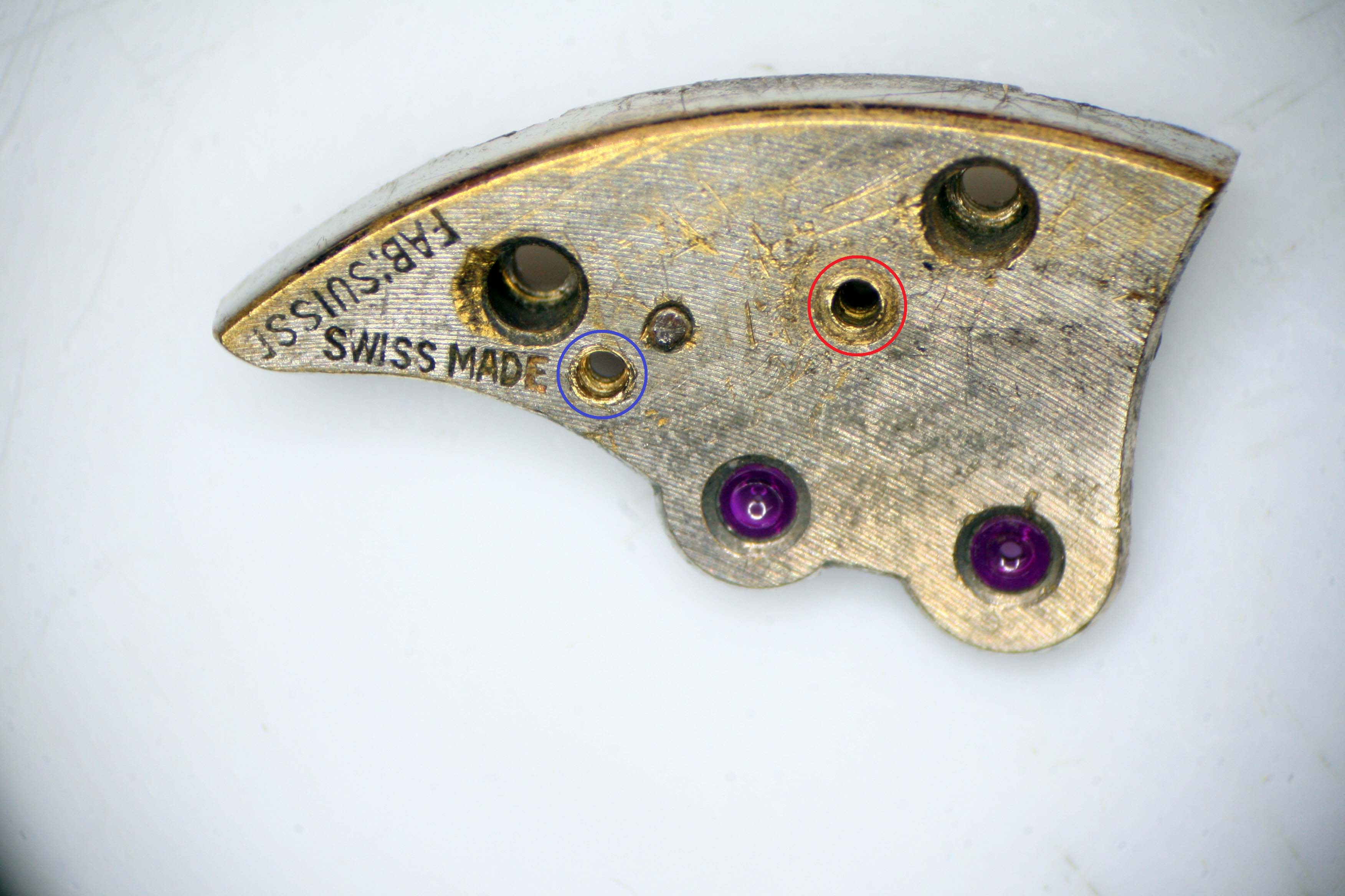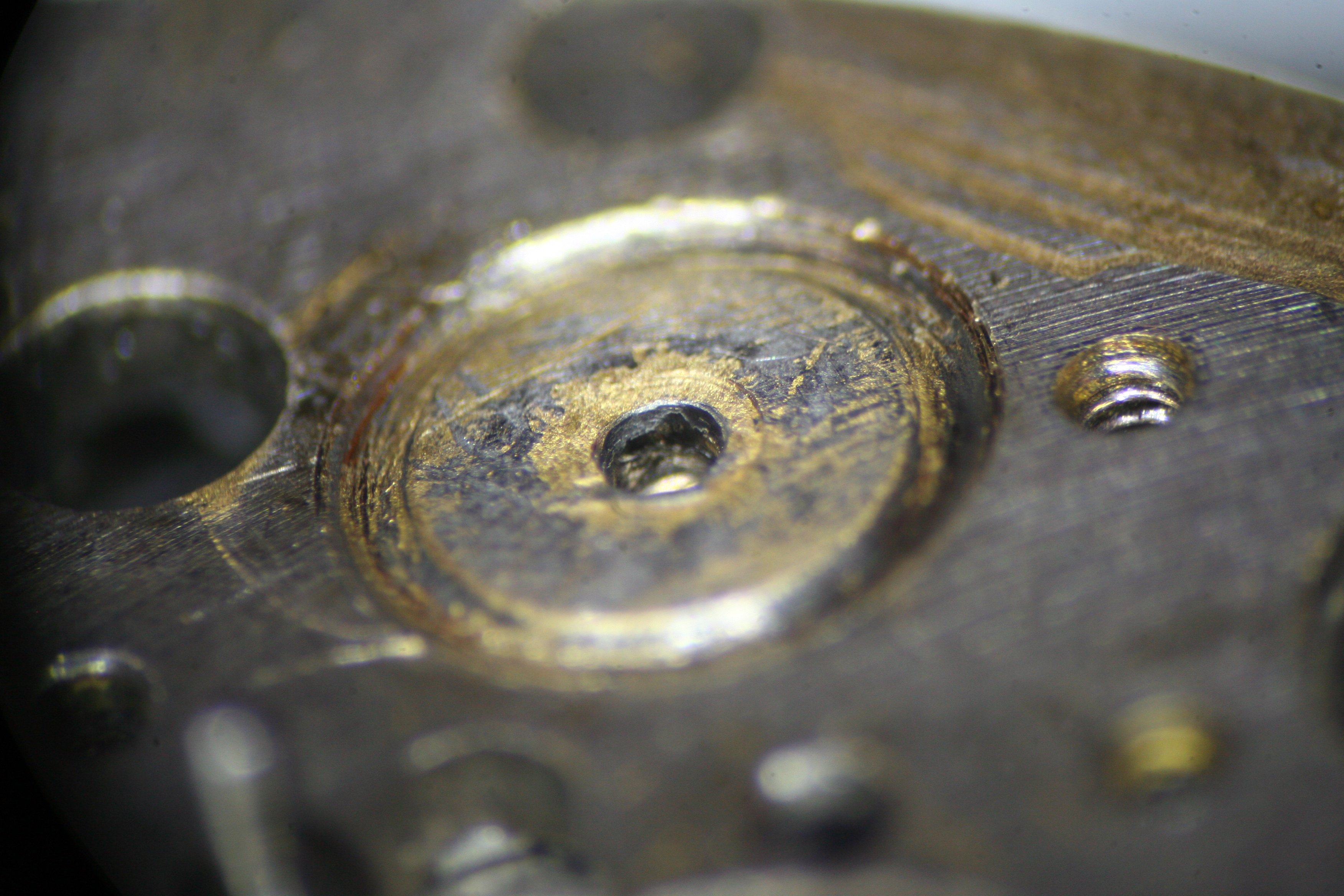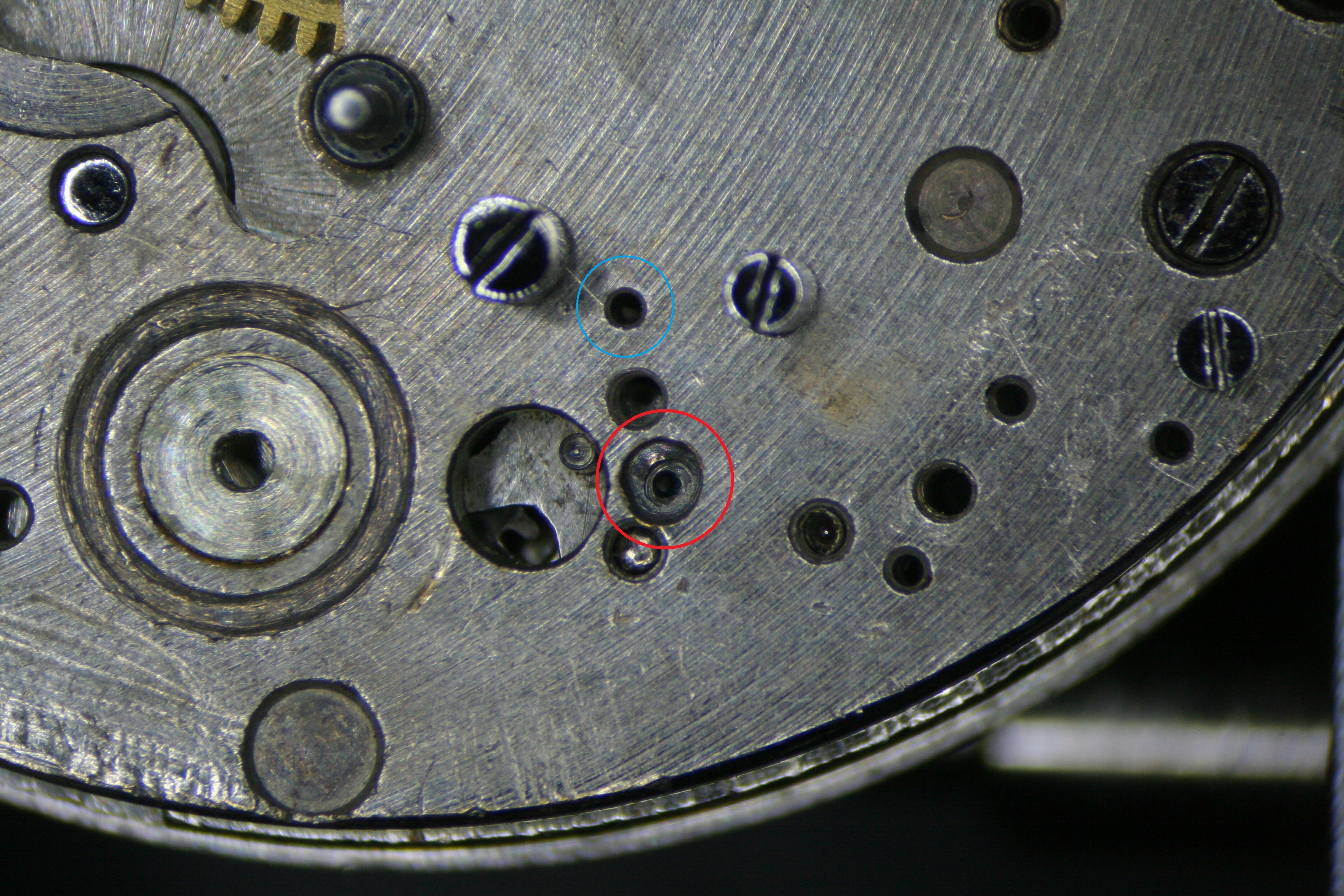 In fact the situation was even worse than that. I soon noticed that the pilot hole for the Coupling Clutch Spring had been drilled out as well (good lord, what was wrong with this fellow?). So the proper fix would be to repair both holes in the bridge and replace the Coupling Clutch and eccentric.