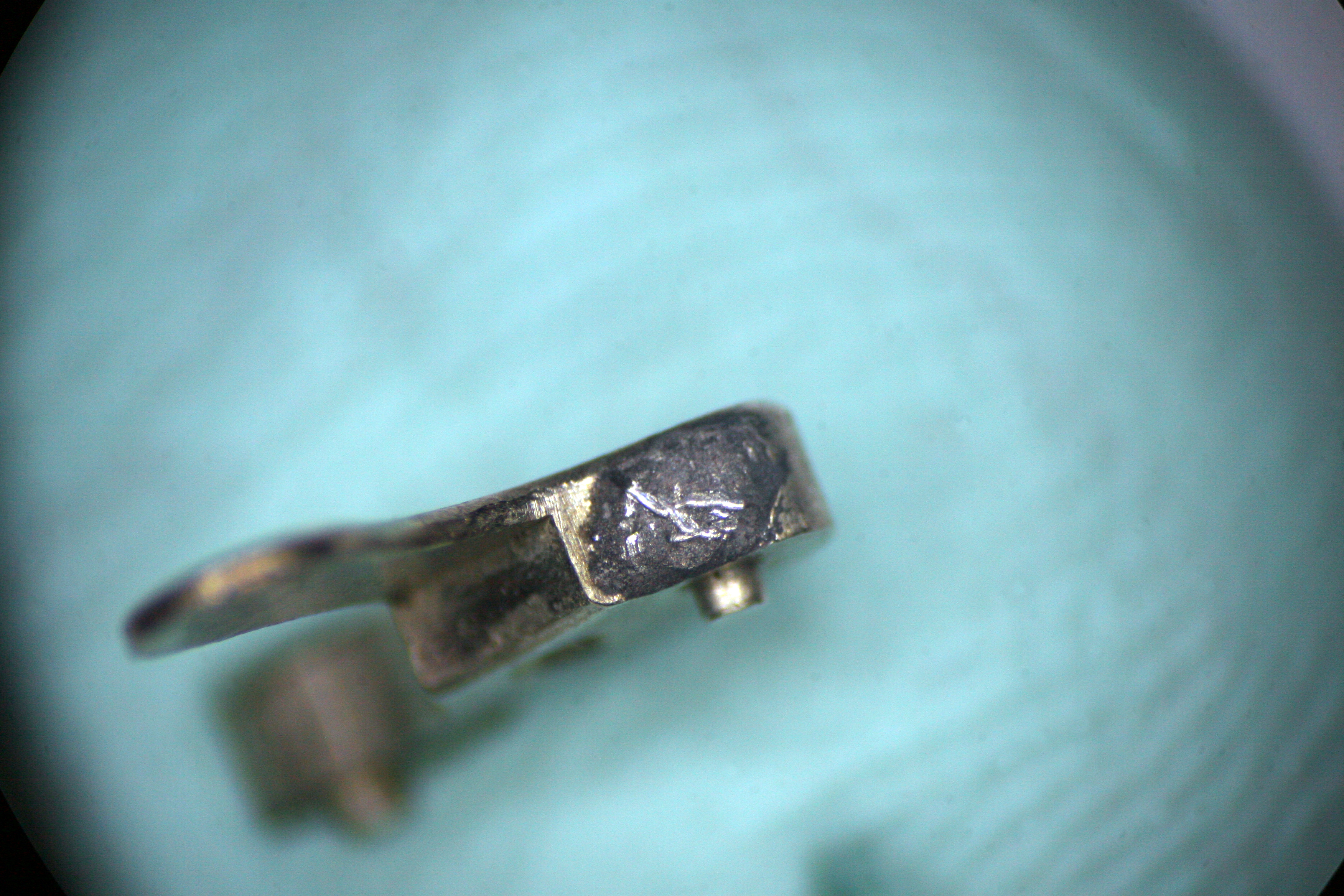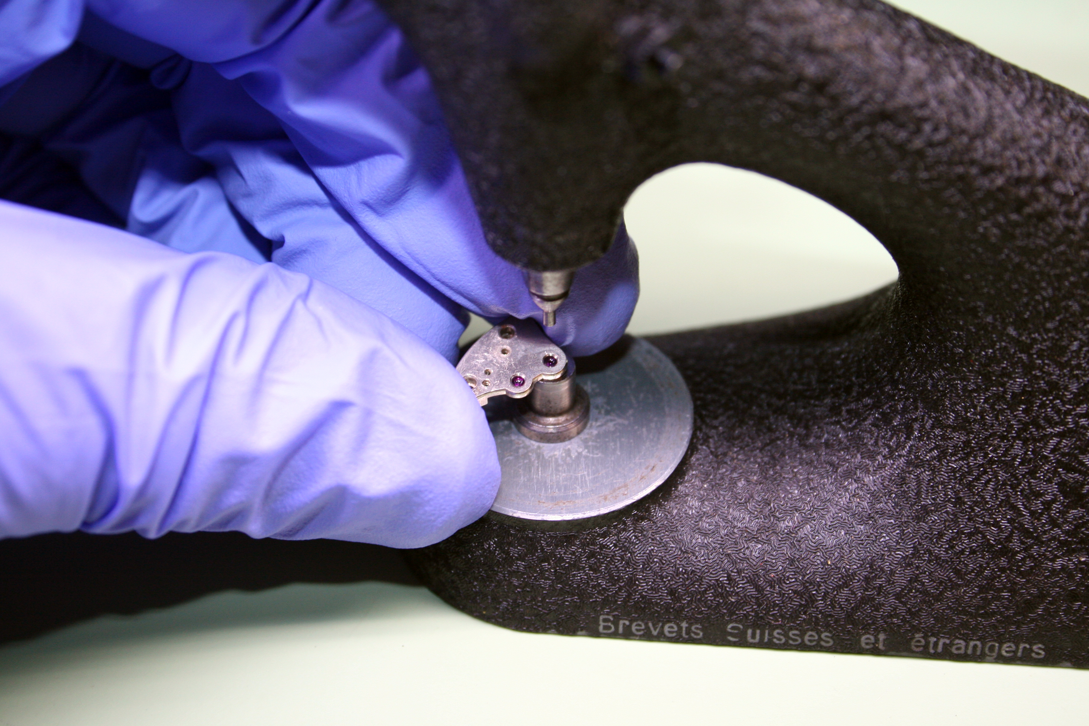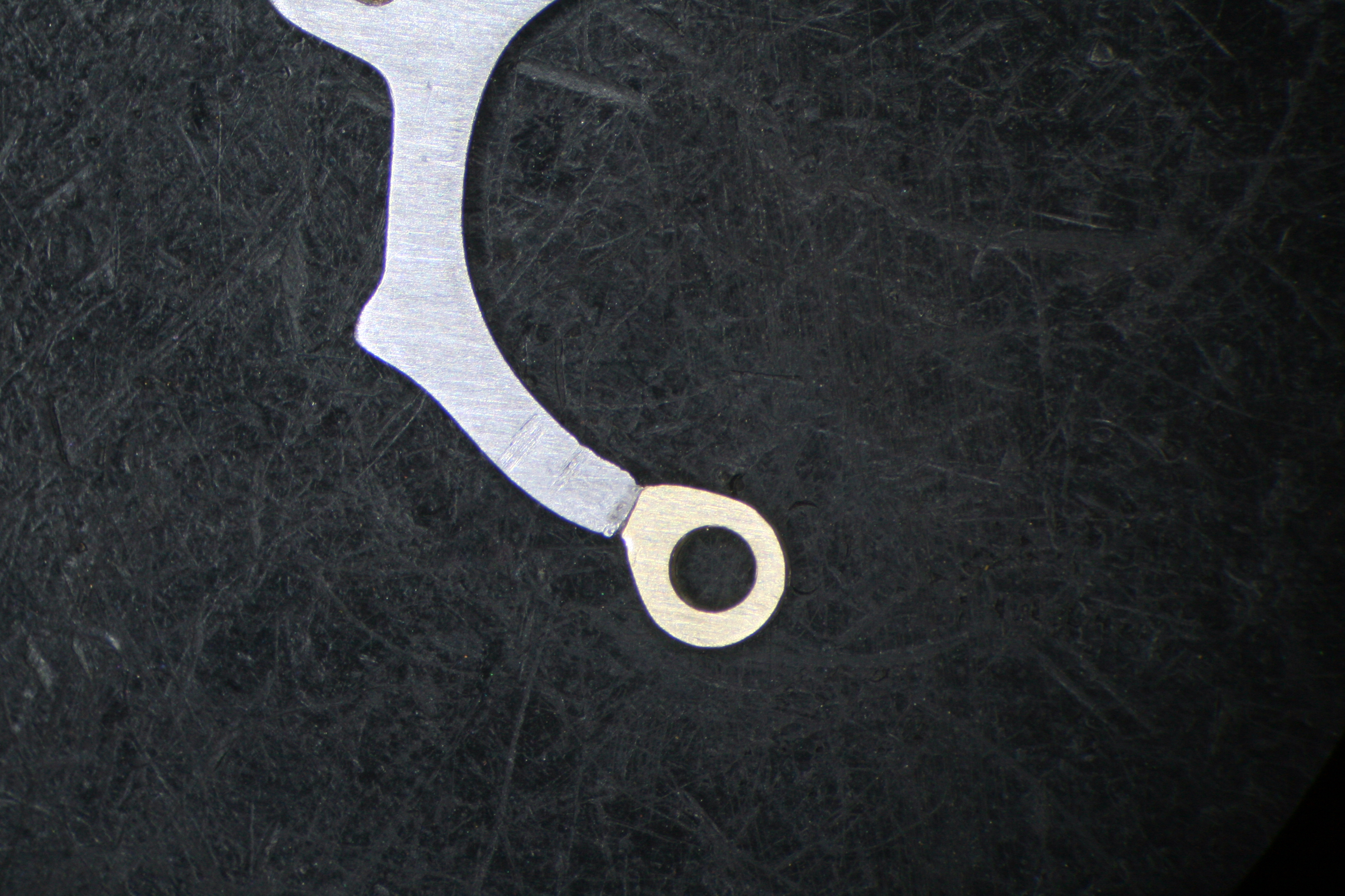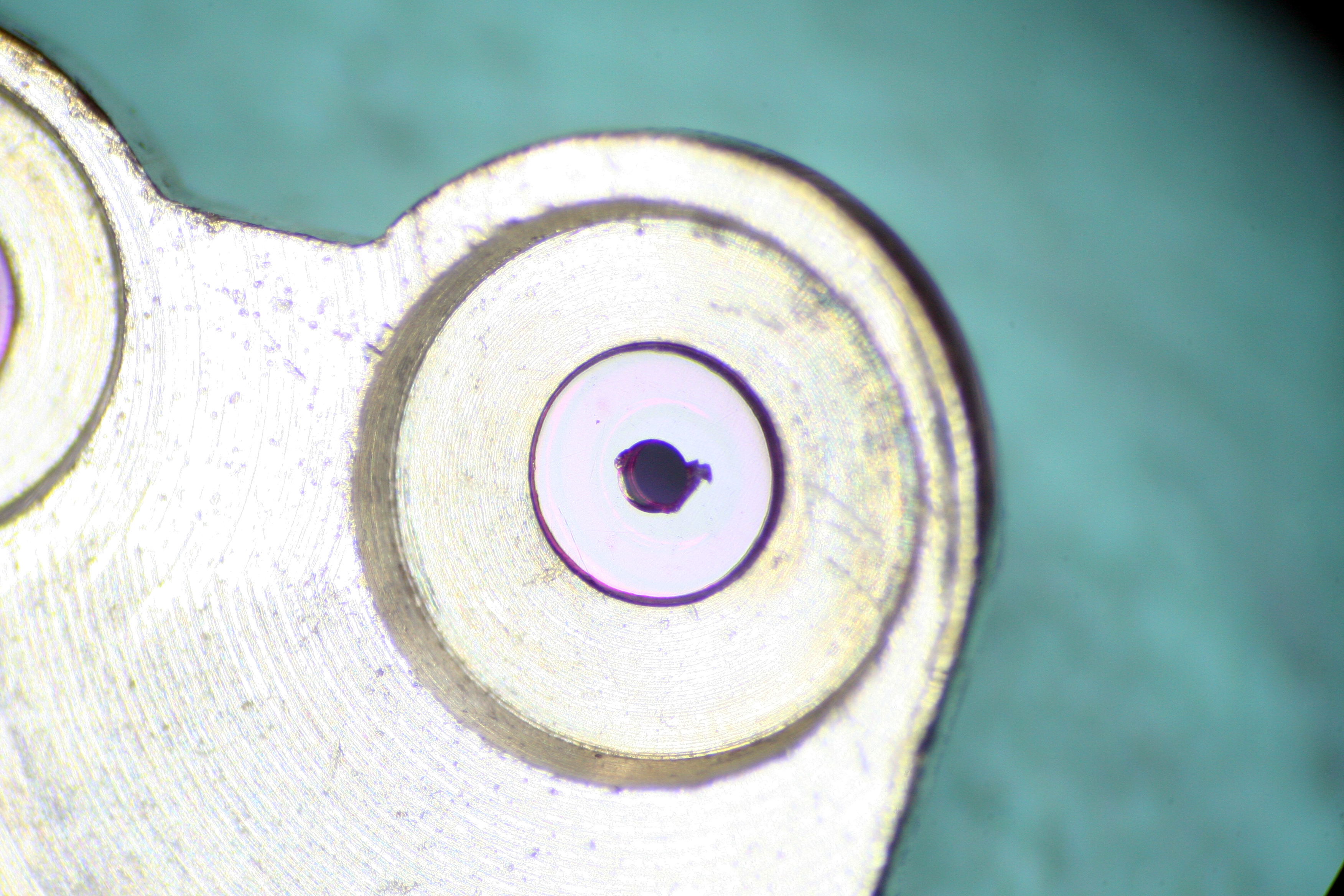 To correct this, I again employed my Seitz jeweling tool. The tool allows a technician (me) to place a concentric hole in the bridge, the diameter being measurable down to a hundredth of a millimeter. This hole was then filled with a brass slug into which a new pilot hole was bored. The pilot hole for the Blocking Lever Spring is quite small. To set the size, I measured the diameter of the guide pin on the micrometer- just 0.34mm!