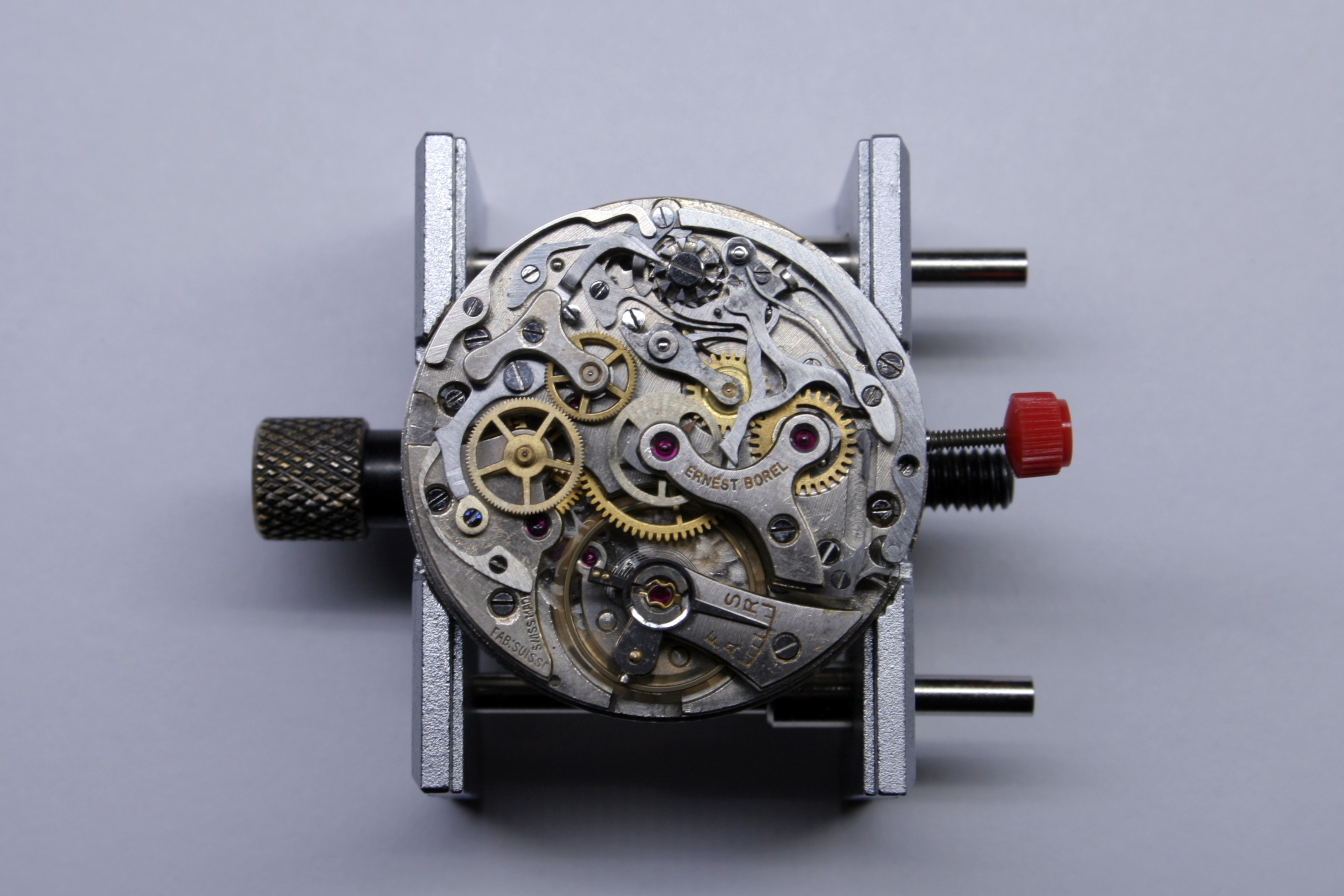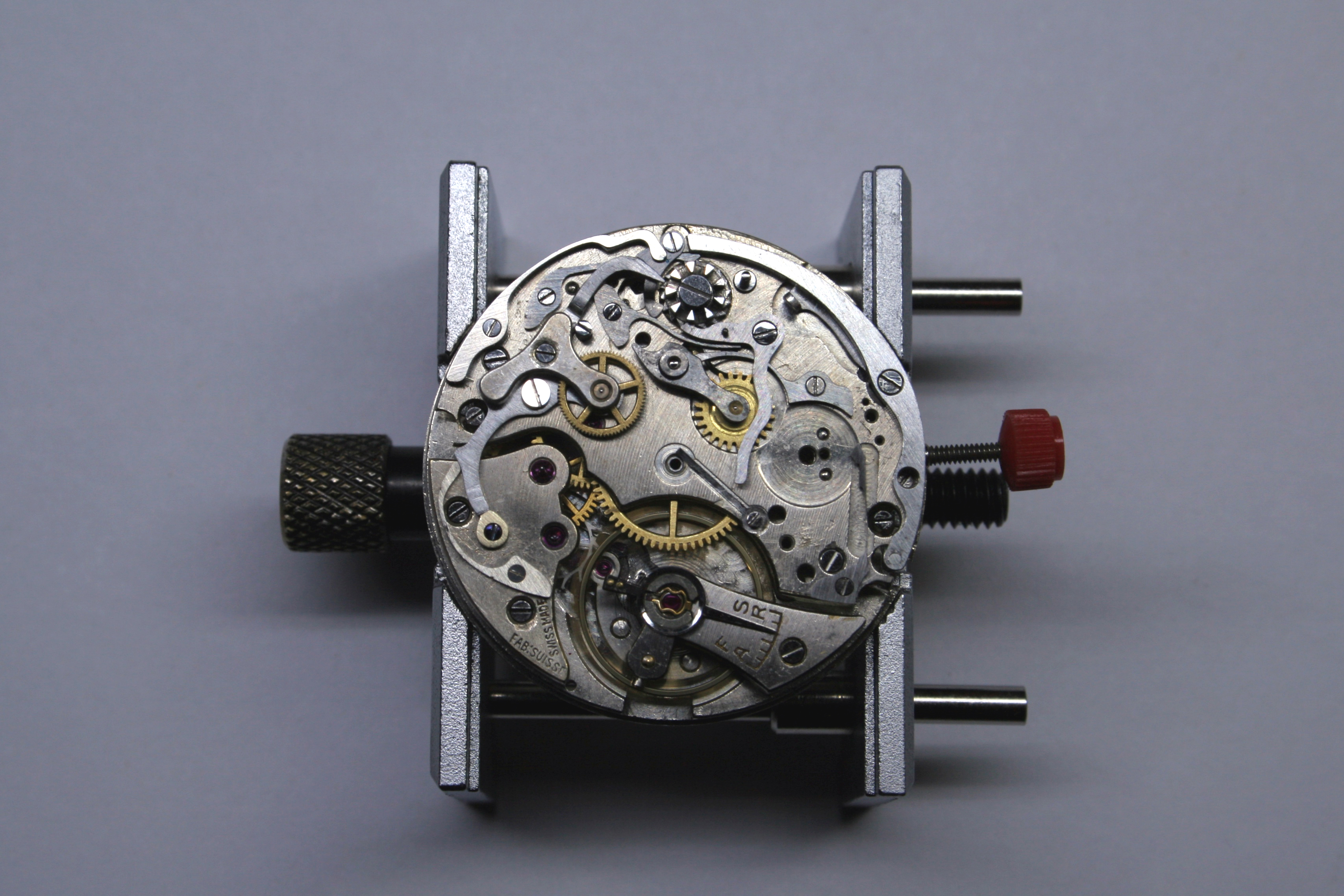 Despite this, I’ve finally reached a point where I can enjoy the fruits of my labor. I don’t have a case for this movement but just seeing it ticking on the bench is rewarding. This movement was dead but not anymore. It is also quite a fine movement- the Valjoux 23 and 72 chronograph movements were considered by many the best of their era (although Longines and Lemania fans may dispute this). This particular piece had quite a fine finish, although it does have many, many scratches now.