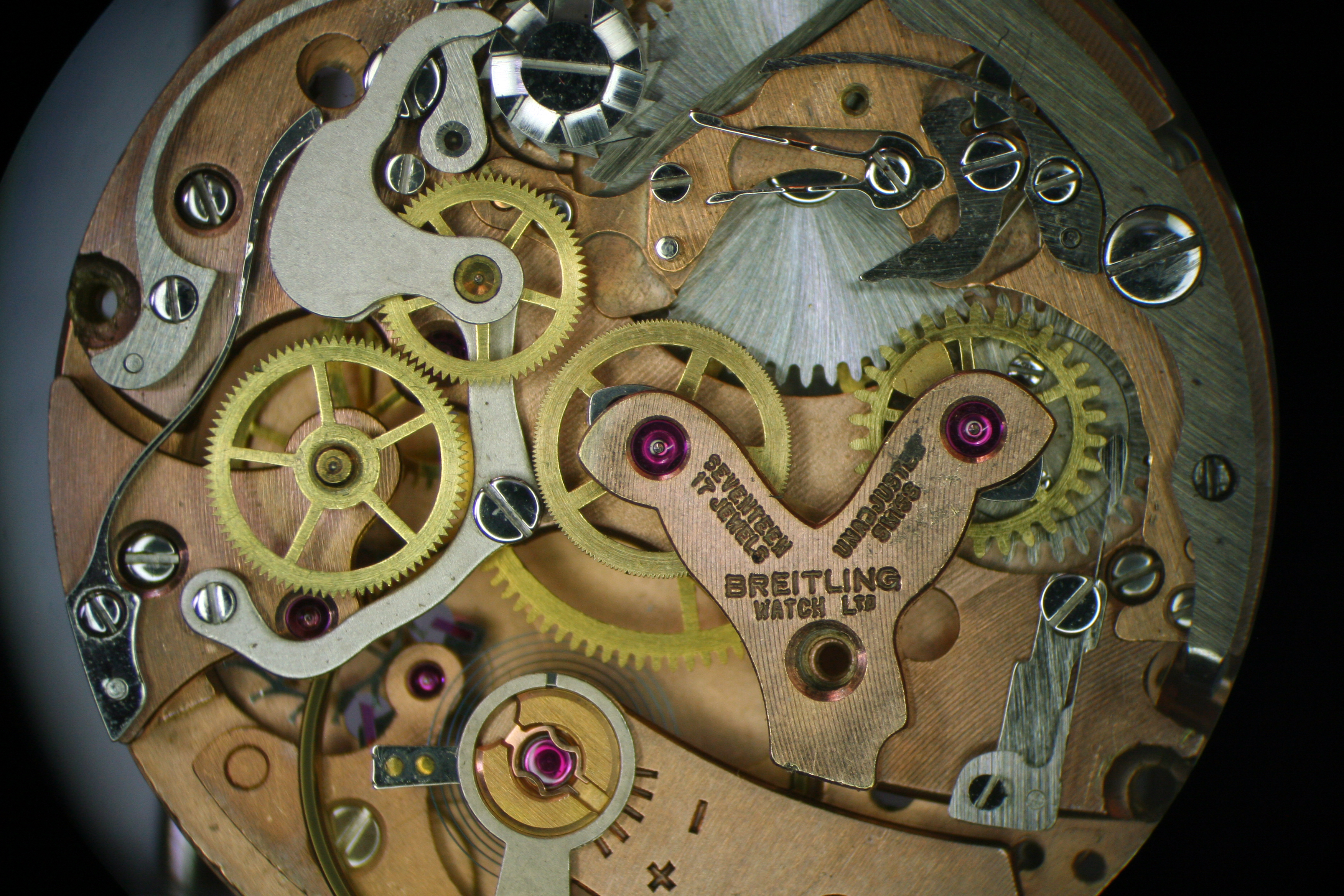 You may notice there’s a couple of minor differences between this Navitimer movement and the one I serviced earlier. This movement is from the late 1960’s and by this time the Venus company must have been feeling pressure to reduce production costs. There’s no perlage finish like before and the Breuget hairspring has been replaced with a simpler flat hairspring. The screws also have a different finish- rounded edges instead of the sharp 90 degree angles seen on the earlier movement.