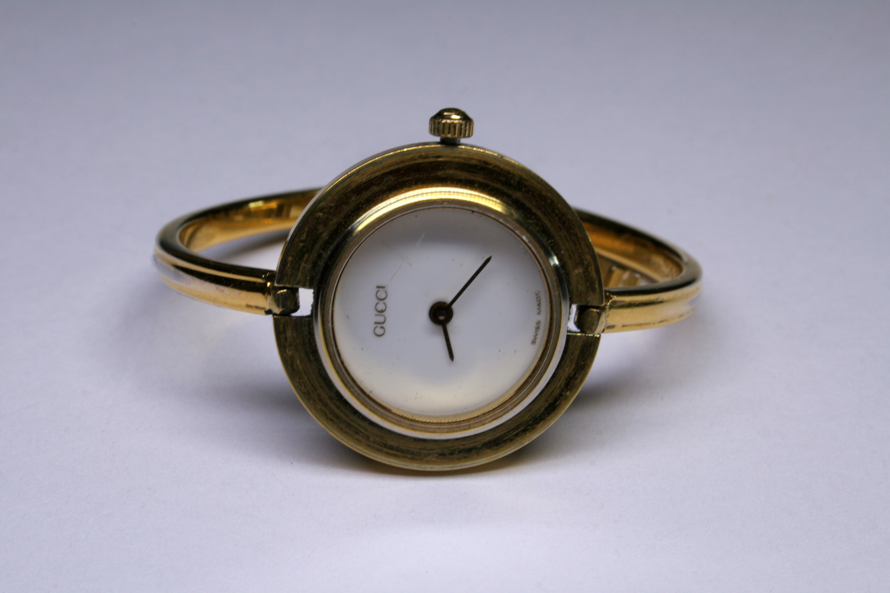 My mother has an appreciation for watches and as such has some fine time pieces but I believe this is her favorite. This watch was sold by Gucci in the early nineties and has a neat feature- the colored bezel is removable and can be changed to match or accent the owner’s outfit. Included with the watch at the time of sale were a dozen bezels of differing colors, each threaded so that you could remove one and replace it with another at your whim. The original bezel was green with a red pinstripe but it has been lost to time, fortunately she has others to chose from.