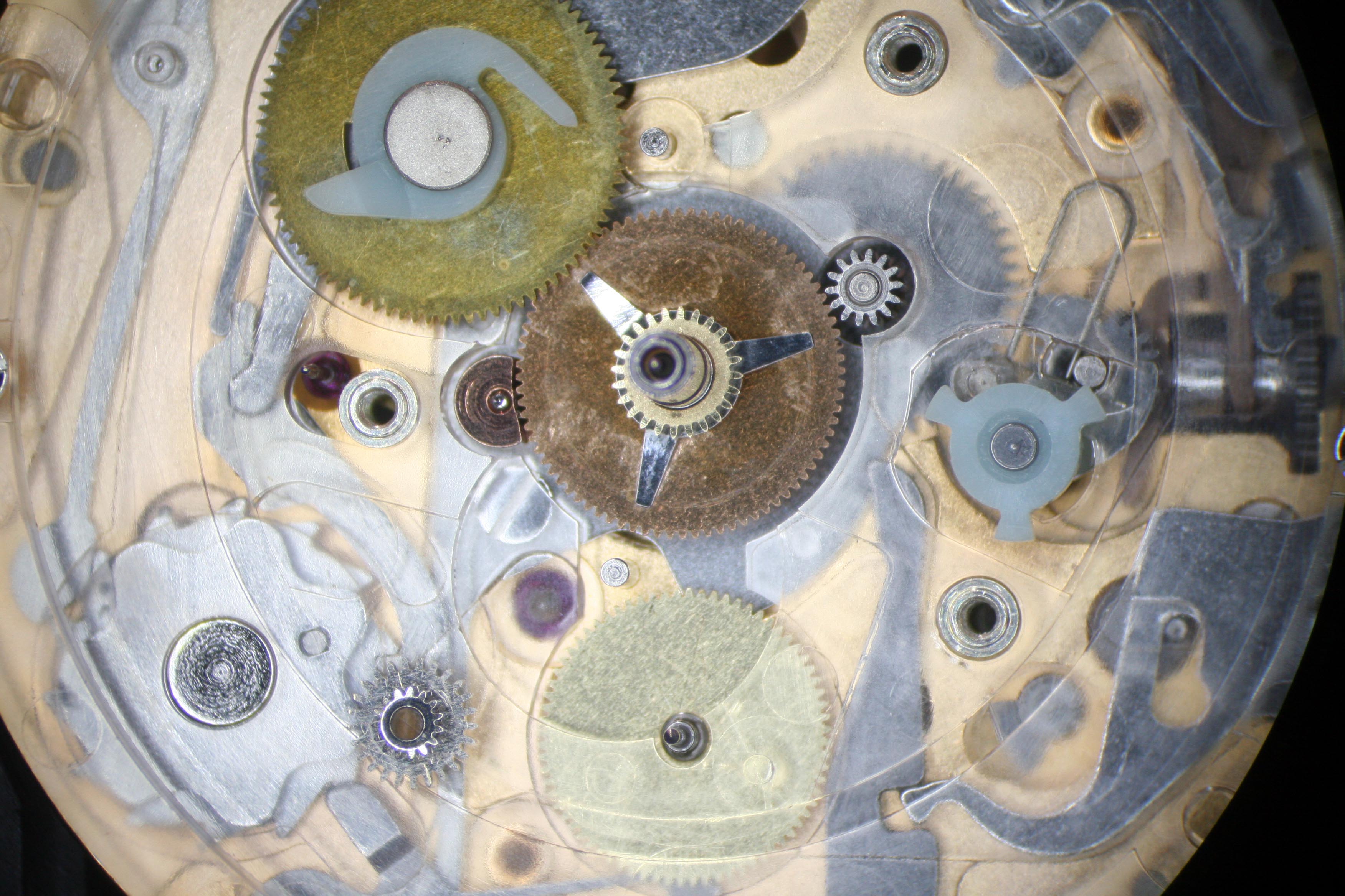The chronograph works come apart (and go together) easily with the acrylic plate removed. The stains on the bottom plate and copious bits of debris furthered my suspicion that this watch has not been properly serviced in many years.