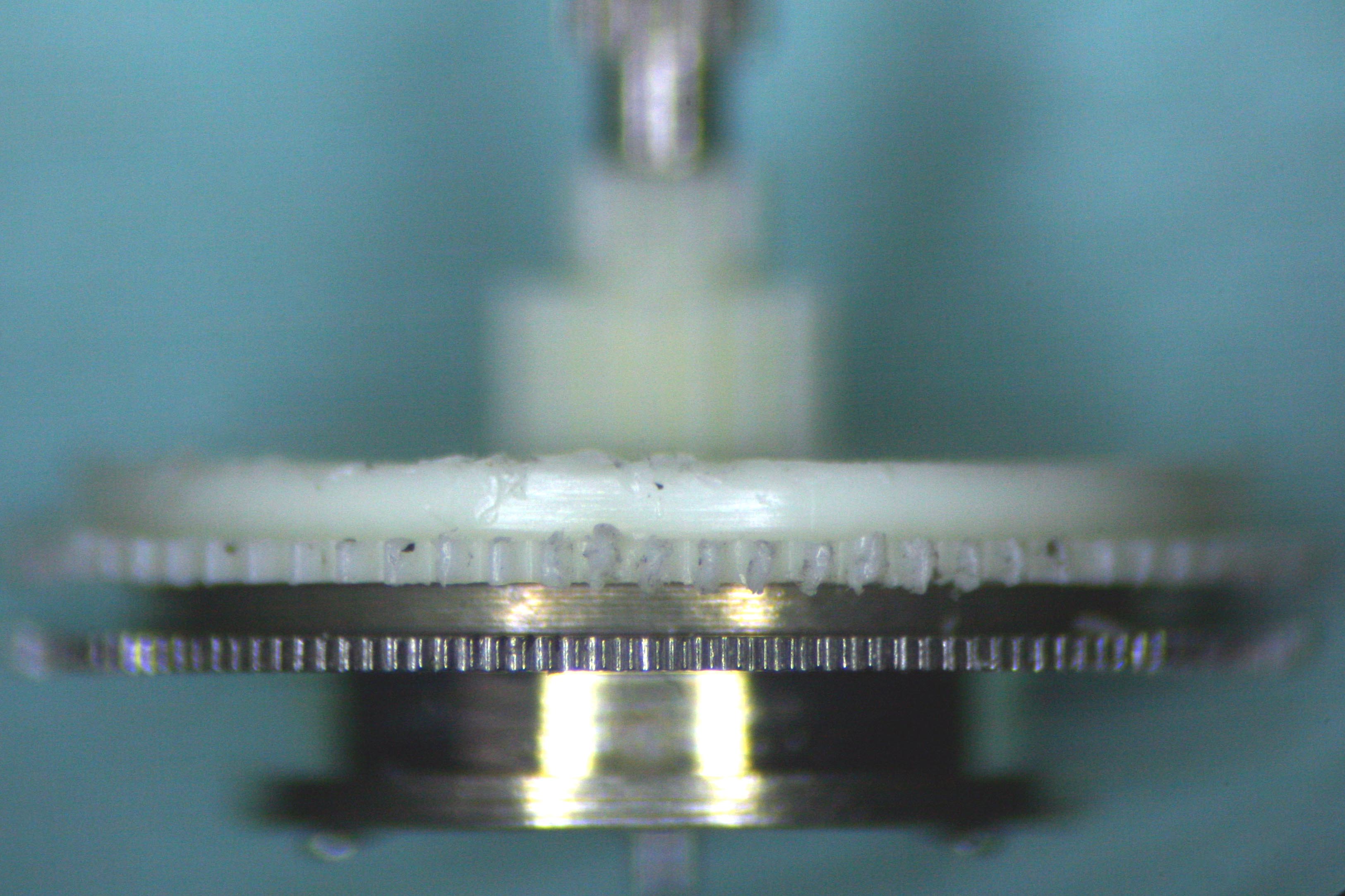 At first sight the Going Train appeared okay but when I inspected each wheel individually I noticed the Coupling Runner was damaged. The Delrin (nylon) gear teeth were deformed all around the circumference of the wheel. The runner transmits power from the Going Train to the chronograph second and minute hands so unless the teeth could be repaired the chronograph function would never work. I set about straightening them one-by-one with my smallest screwdriver until they looked about right. I wouldn’t know until I finished cleaning and reassembling the movement if the repair worked so I just crossed my fingers and hoped.
