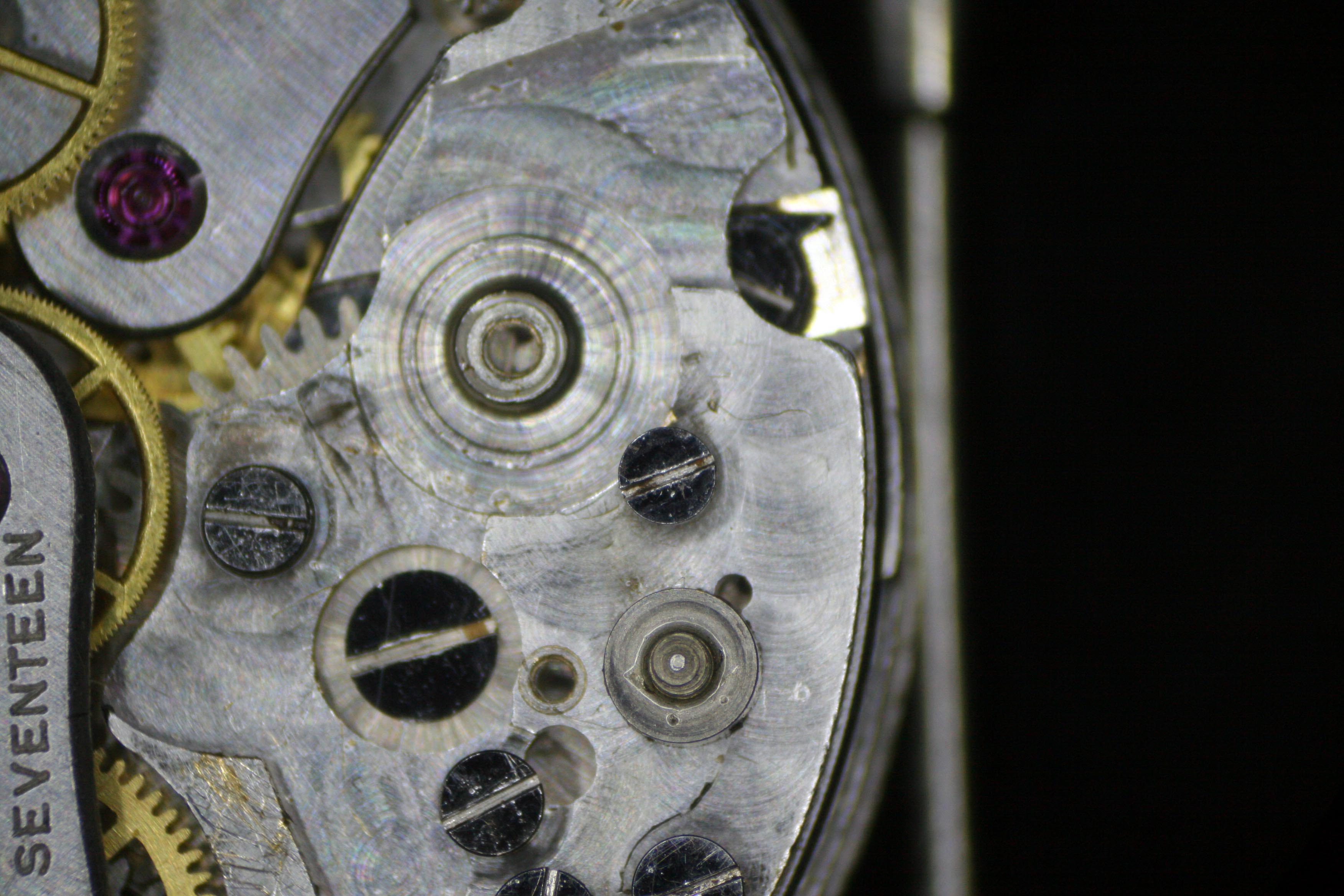 One thing I’m always on the lookout for in an older watch is whether or not a Breguet Hairspring has been used in the Escapement. Developed by Abraham-Louis Breguet in the eighteenth century, the Breguet or Overcoil Hairspring was found to provide more accurate timekeeping as the Mainspring unwound and the escapement lost amplitude. By the end of the twentieth century the materials used in the manufacture of balance wheels and hairsprings had more or less negated the need for overcoil hairsprings and most watches were manufactured with a flat hairspring instead. The flat hairspring is easier to produce though slightly less attractive than an overcoil. Movado opted for the overcoil hairspring and so I had to take a picture.
