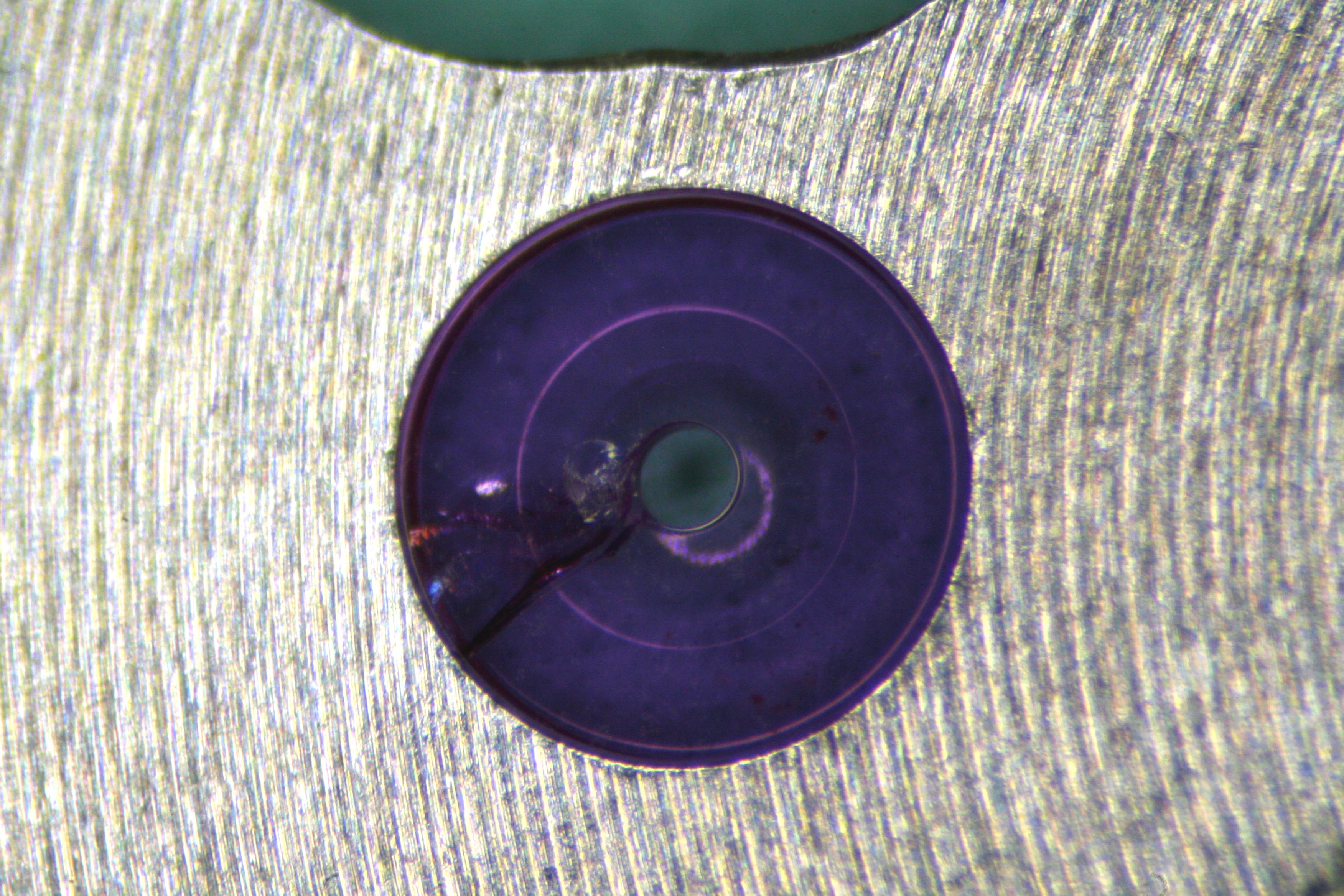 First discovered was a broken jewel in the Chronograph Bridge. This almost certainly resulted from the action of securing the Chronograph Hand (the large sweep second hand) to the extended pivot of the Chronograph Runner. Pressing too hard on the hand will transmit the force back through the runner and onto jeweled bearing. It doesn’t take much pressure to crack or chip a jewel. Fortunately I already had a replacement in my parts supply.
