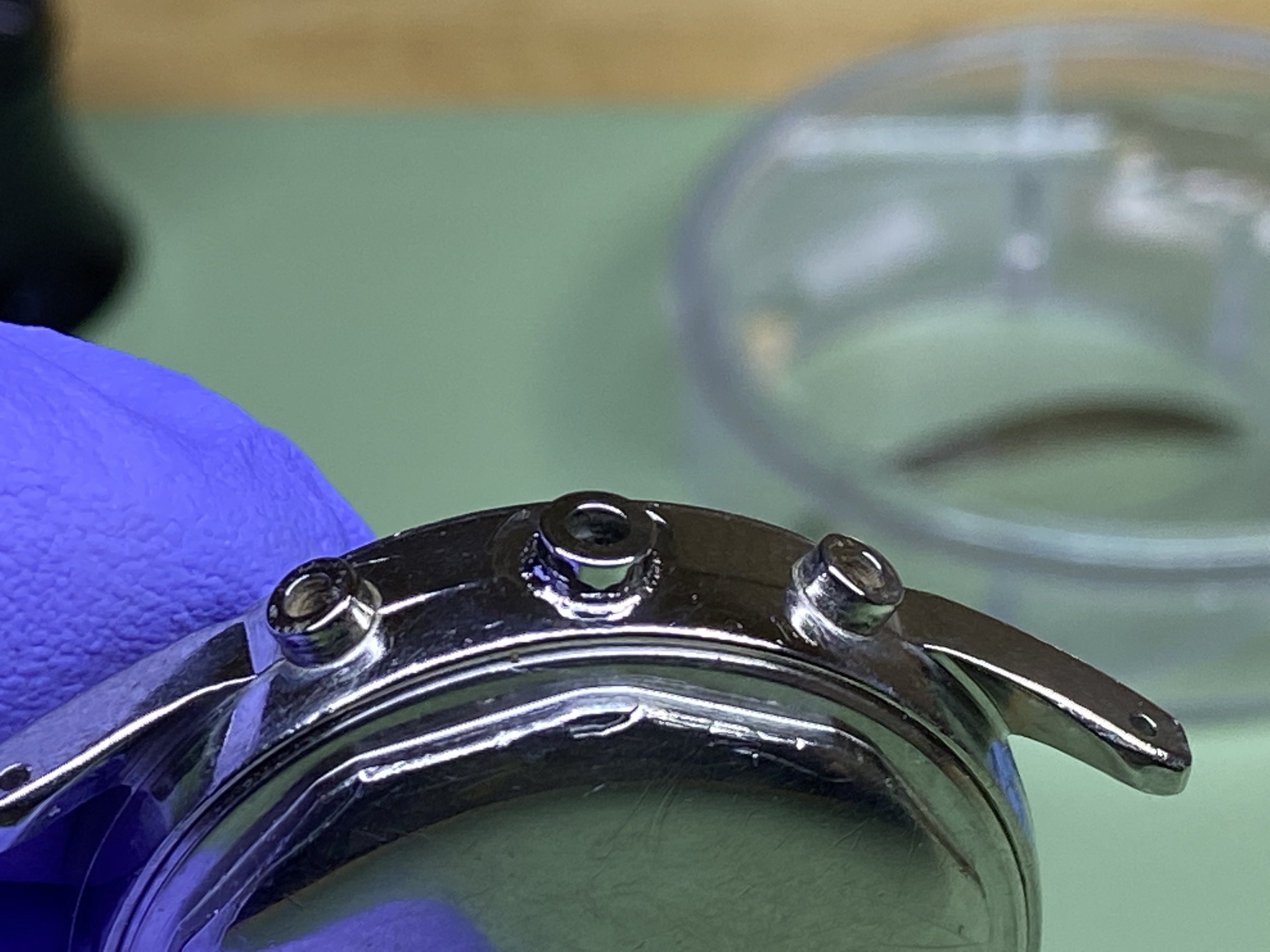 After several months and a bit of gentle prodding the watch case was returned with the new pendant tube installed. The new tube is micro welded in place much like the original would have been brazed but since I don’t possess the tool for seating the cork pendant tube gasket I had to proceed without it. I hope to fabricate the tool and gasket at a later date and then finish waterproofing the watch case.